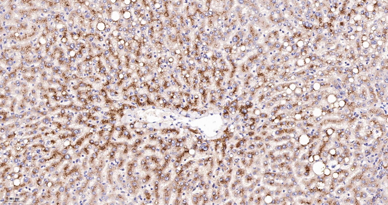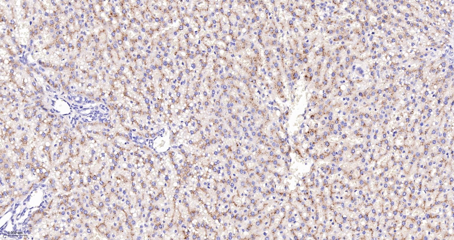 Paraformaldehyde-fixed, paraffin embedded Mouse liver ; Antigen retrieval by boiling in sodium citrate buffer (pH6.0) for 15 min; Antibody incubation with LAMP2 Monoclonal Antibody, Unconjugated (bsm-61207R) at 1:200 overnight at 4°C, followed by conjugation to the bs-0295G-HRP and DAB (C-0010) staining.