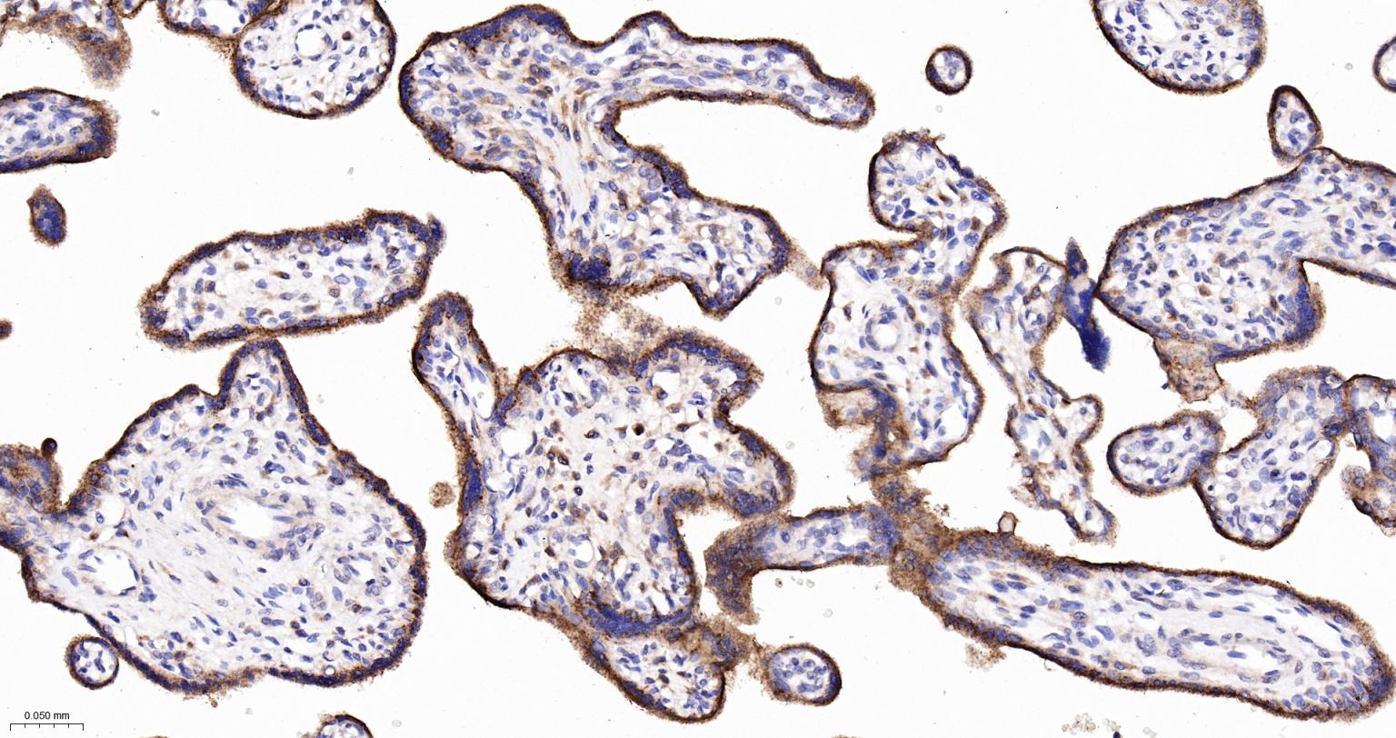 Paraformaldehyde-fixed, paraffin embedded Human placenta;Antigen retrieval by boiling in sodium citrate buffer (pH6.0) for 15 min; Antibody incubation with LAMP2 Monoclonal Antibody, Unconjugated (bsm-61207R) at 1:200 overnight at 4°C, followed by conjugation to the bs-0295G-HRP and DAB (C-0010) staining.