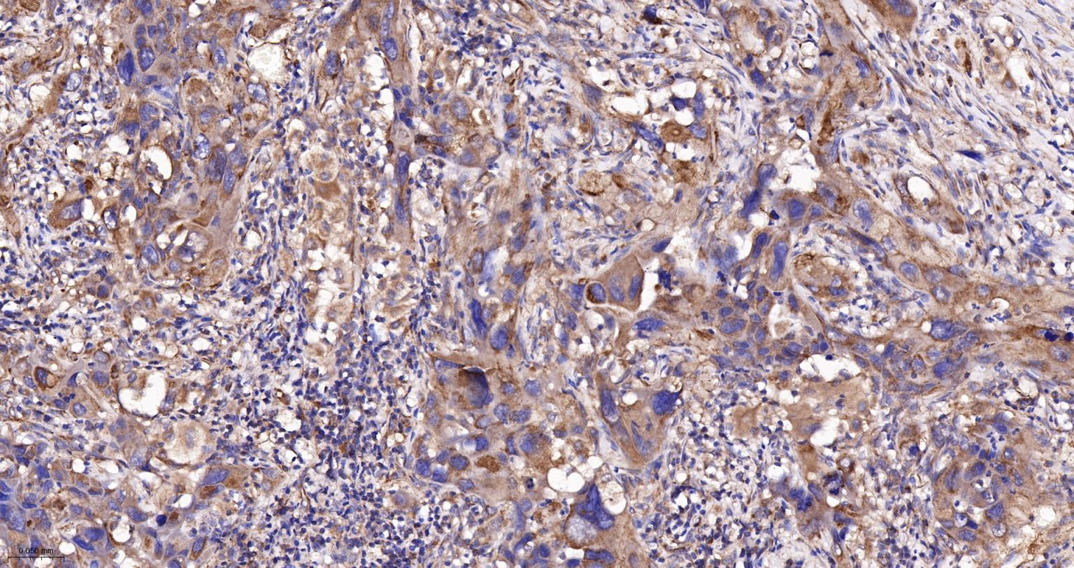 Paraformaldehyde-fixed, paraffin embedded Human Lung Cancer; Antigen retrieval by boiling in sodium citrate buffer (pH6.0) for 15 min; Antibody incubation with Hexokinase 1 Monoclonal Antibody, Unconjugated(bsm-61212R) at 1:200 overnight at 4°C, followed by conjugation to the bs-0295G-HRP and DAB (C-0010) staining.