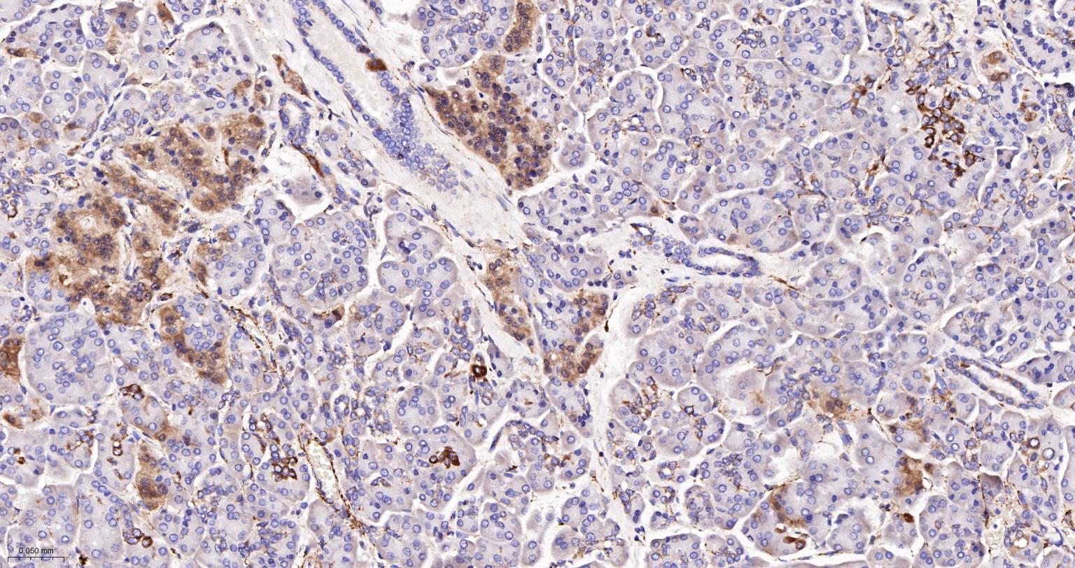 Paraformaldehyde-fixed, paraffin embedded Human Pancreas; Antigen retrieval by boiling in sodium citrate buffer (pH6.0) for 15 min; Antibody incubation with Hexokinase 1 Monoclonal Antibody, Unconjugated(bsm-61212R) at 1:200 overnight at 4°C, followed by conjugation to the bs-0295G-HRP and DAB (C-0010) staining.