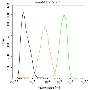 The MCF-7 (H) cells were fixed with 4% PFA (10 min at r.t.) and then permeabilized with 90% ice-cold methanol for 20 min at -20℃,the cells then were incubated in 5%BSA to block non-specific protein-protein interactions (30 min at r.t.), followed by secondary antibody incubation for 40 min at room temperature. Primary Antibody (green):Rabbit Anti-Hexokinase 1 antibody (bsm-61212R): 1 μg/10^6 cells; Isotype Control (orange): Rabbit IgG (bs-0295P). Blank control (black): PBS. Acquisition of 20,000 events was performed.