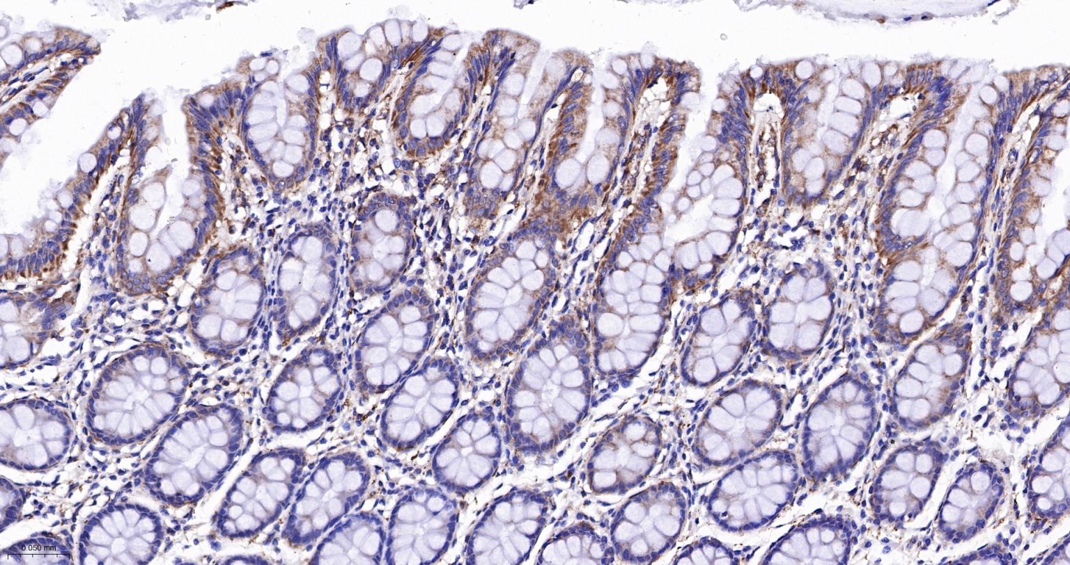 Paraformaldehyde-fixed, paraffin embedded Human Colon; Antigen retrieval by boiling in sodium citrate buffer (pH6.0) for 15 min; Antibody incubation with Hexokinase 1 Monoclonal Antibody, Unconjugated(bsm-61212R) at 1:200 overnight at 4°C, followed by conjugation to the bs-0295G-HRP and DAB (C-0010) staining.