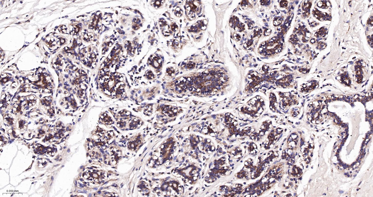 Paraformaldehyde-fixed, paraffin embedded Human Breast Cancer; Antigen retrieval by boiling in sodium citrate buffer (pH6.0) for 15 min; The section was incubated with Hexokinase 1 Monoclonal Antibody, Unconjugated (bsm-61212R) at 1:200 overnight at 4°C, followed by conjugation to the bs-0295G-HRP and DAB (C-0010) staining.