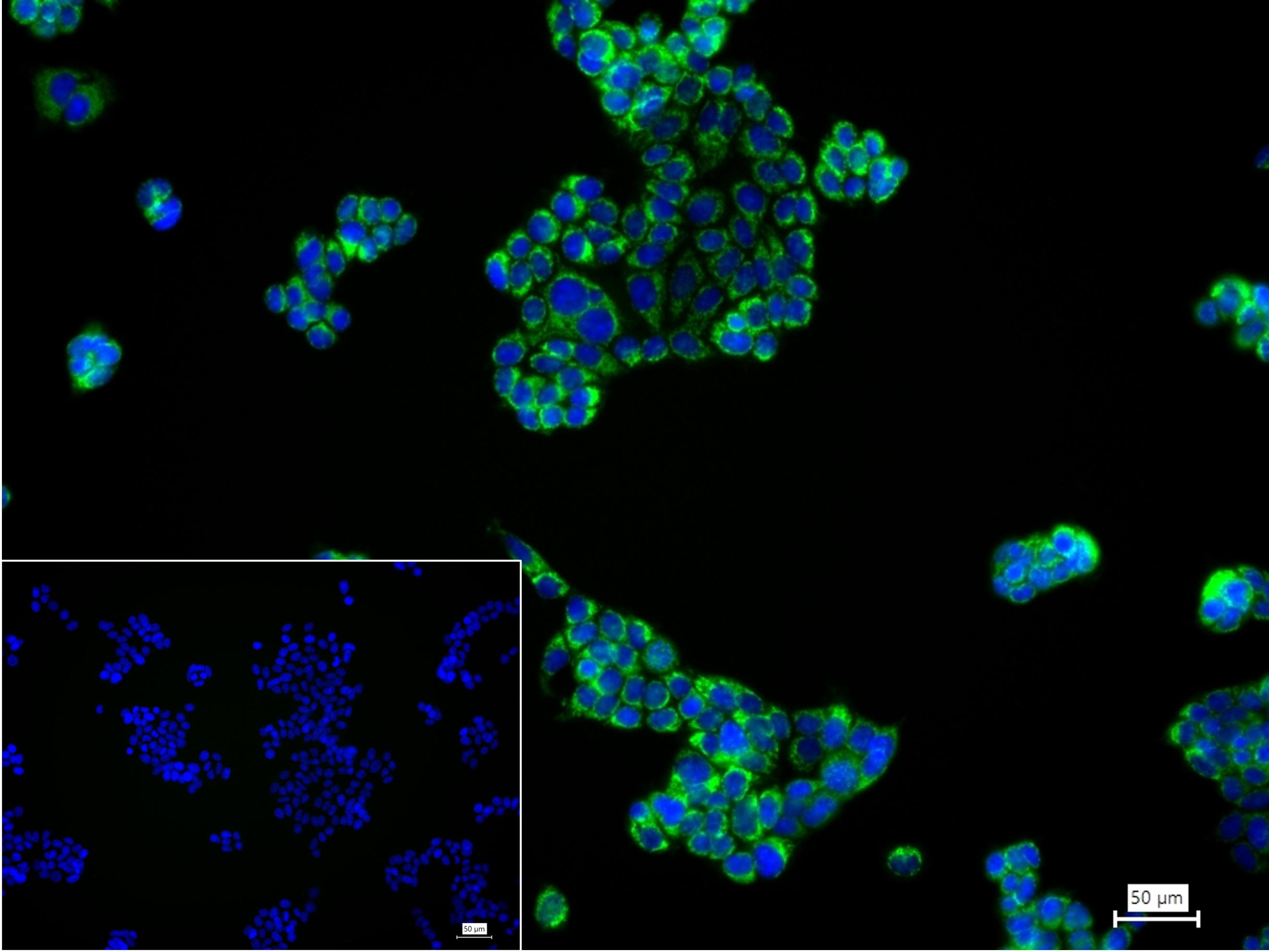 4% Paraformaldehyde-fixed MCF-7 (H) cell; Triton X-100 at r.t. for 20 min; Antibody incubation with (Hexokinase 1) monoclonal Antibody, unconjugated (bsm-61212R) 1:100, 90 min at 37°C; followed by BF488 conjugated Goat Anti-Rabbit IgG antibody (green, bs-60295G-BF488) at 37°C for 90 min, DAPI (blue, C02-04002) was used to stain the cell nuclei. PBS instead of the primary antibody was used as the blank control.