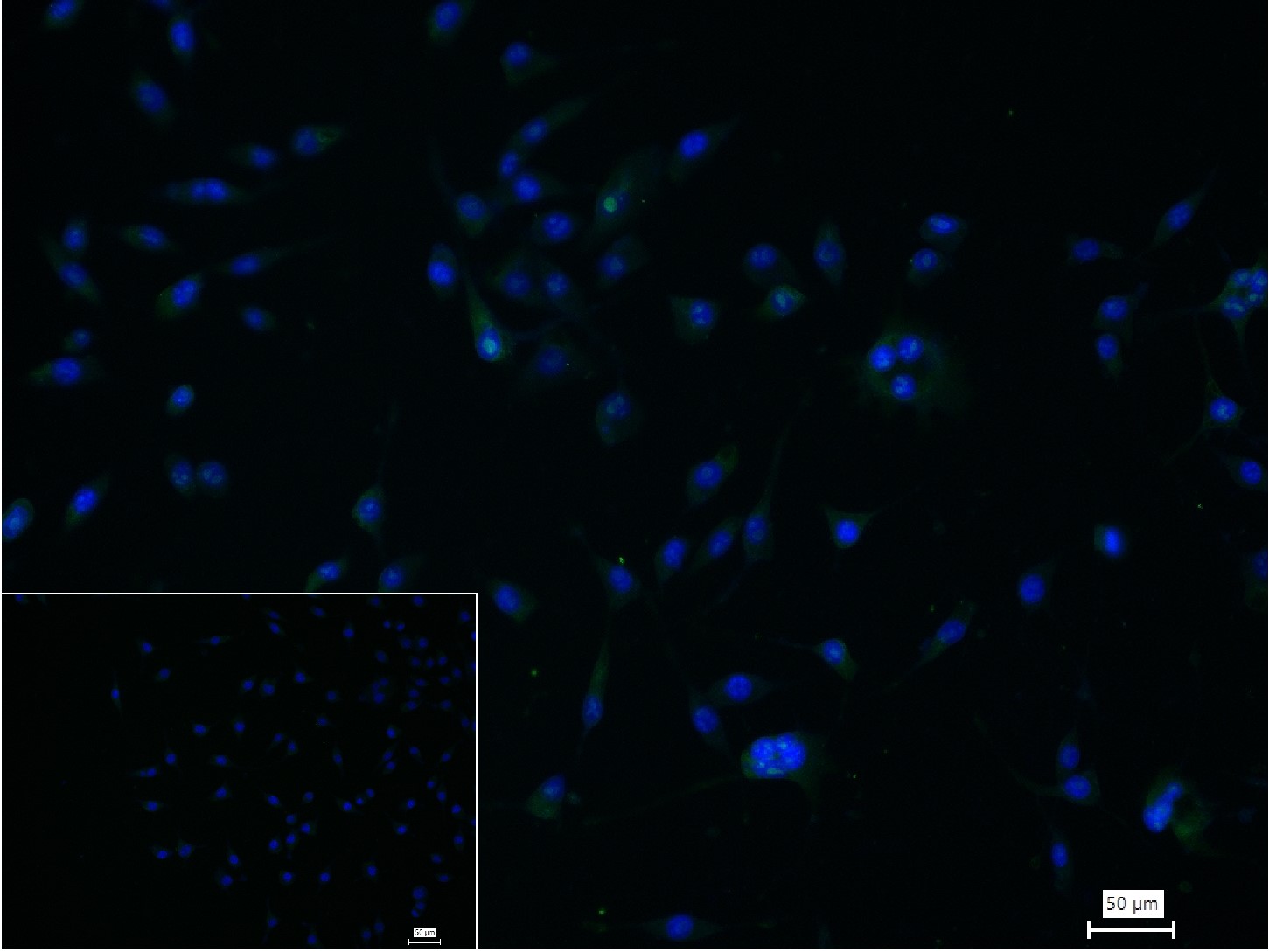 4% Paraformaldehyde-fixed SH-SY5Y (H) cell; Triton X-100 at r.t. for 20 min; Antibody incubation with (Dnmt3a) monoclonal Antibody, unconjugated (bsm-61213R) 1:100, 90 min at 37°C; followed by conjugated Goat Anti-Rabbit IgG antibody (green, bs-60295G-FITC) at 37°C for 90 min, DAPI (blue, C02-04002) was used to stain the cell nuclei. PBS instead of the primary antibody was used as the blank control.