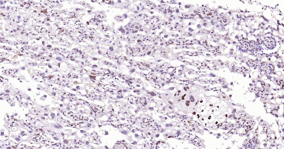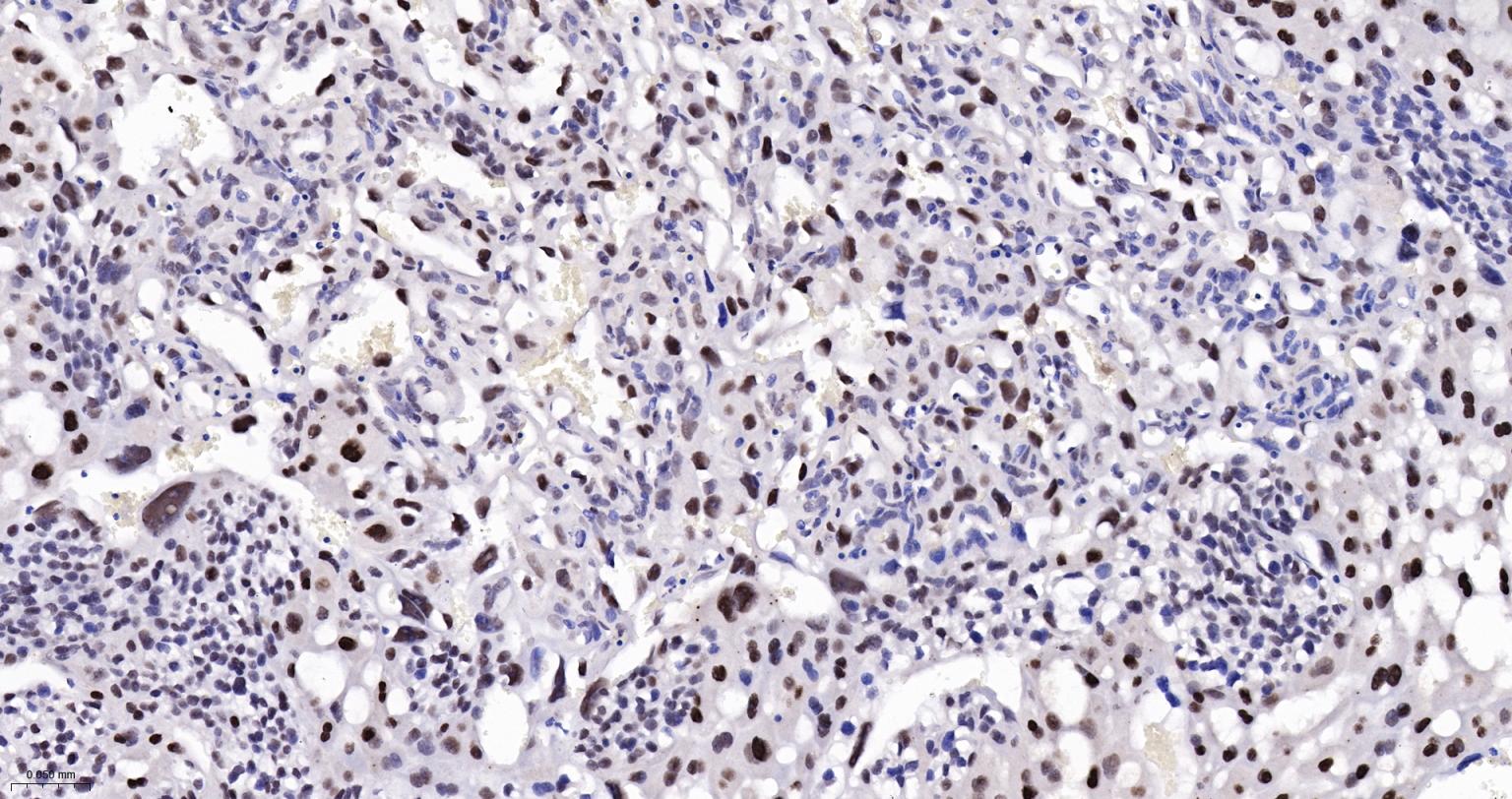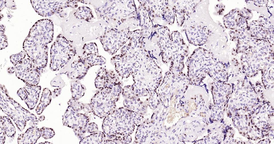 Paraformaldehyde-fixed, paraffin embedded Rat Placenta; Antigen retrieval by boiling in sodium citrate buffer (pH6.0) for 15 min; Antibody incubation with Dnmt3a Monoclonal Antibody, Unconjugated(bsm-61213R) at 1:200 overnight at 4°C, followed by conjugation to the SP Kit (Rabbit, SP-0023) and DAB (C-0010) staining.
