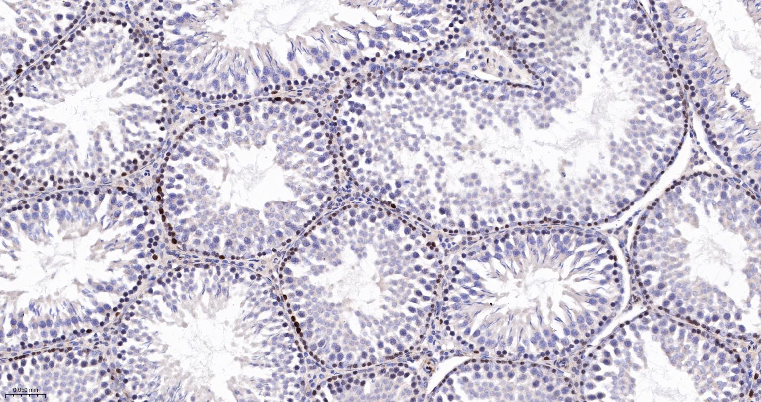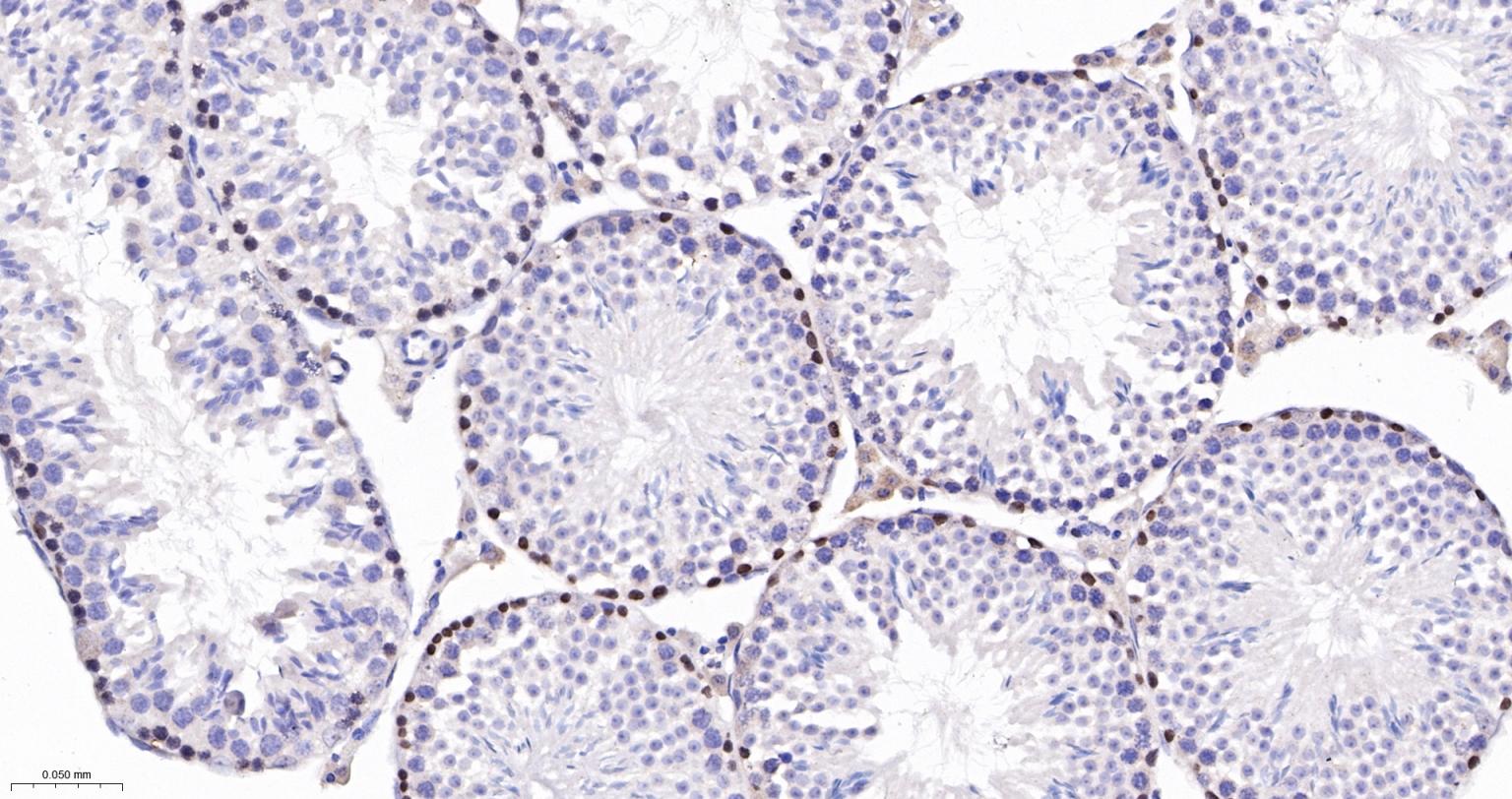 Paraformaldehyde-fixed, paraffin embedded Rat Testicles; Antigen retrieval by boiling in sodium citrate buffer (pH6.0) for 15 min; Antibody incubation with Dnmt3a Monoclonal Antibody, Unconjugated(bsm-61213R) at 1:200 overnight at 4°C, followed by conjugation to the SP Kit (Rabbit, SP-0023) and DAB (C-0010) staining.