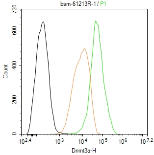 The NCCIT (H) cells were fixed with 4% PFA (10 min at r.t.) and then permeabilized with 90% ice-cold methanol for 20 min at -20℃,the cells then were incubated in 5%BSA to block non-specific protein-protein interactions (30 min at r.t.), followed by secondary antibody incubation for 40 min at room temperature. Primary Antibody (green):Rabbit Anti-Dnmt3a antibody (bsm-61213R): 1 μg/10^6 cells; Isotype Control (orange): Rabbit IgG (bs-0295P). Blank control (black): PBS. Acquisition of 20,000 events was performed.