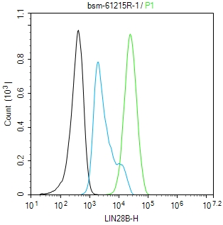 The HepG2 (H) cells were fixed with 4% PFA (10 min at r.t.) and then permeabilized with 90% ice-cold methanol for 20 min at -20℃,the cells then were incubated in 5%BSA to block non-specific protein-protein interactions (30 min at r.t.).Primary Antibody (green):Rabbit Anti-LIN28B antibody (bsm-61215R,1:100); Secondary Antibody (white blue): Goat anti-Rabbit IgG-BF488 (bs-60295G-BF488): 1 μg/test. Blank control (black): PBS. Acquisition of 20,000 events was performed.