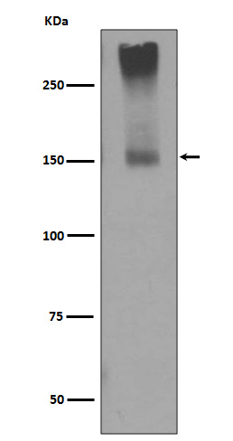 Western blot analysis of mouse brain lysate. Using mGluR5 (bsm-61218R) monoclonal antibody at 1:1000 dilution and 4°C overnight incubation. Followed by conjugated secondary antibody incubation at r.t. for 60 min.