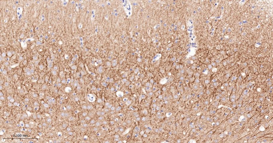 Paraformaldehyde-fixed, paraffin embedded Rat Cerebrum; Antigen retrieval by boiling in sodium citrate buffer (pH6.0) for 15 min; The section was incubated with mGluR5 Monoclonal Antibody, Unconjugated (bsm-61218R) at 1:200 overnight at 4°C, followed by conjugation to the bs-0295G-HRP and DAB (C-0010) staining.