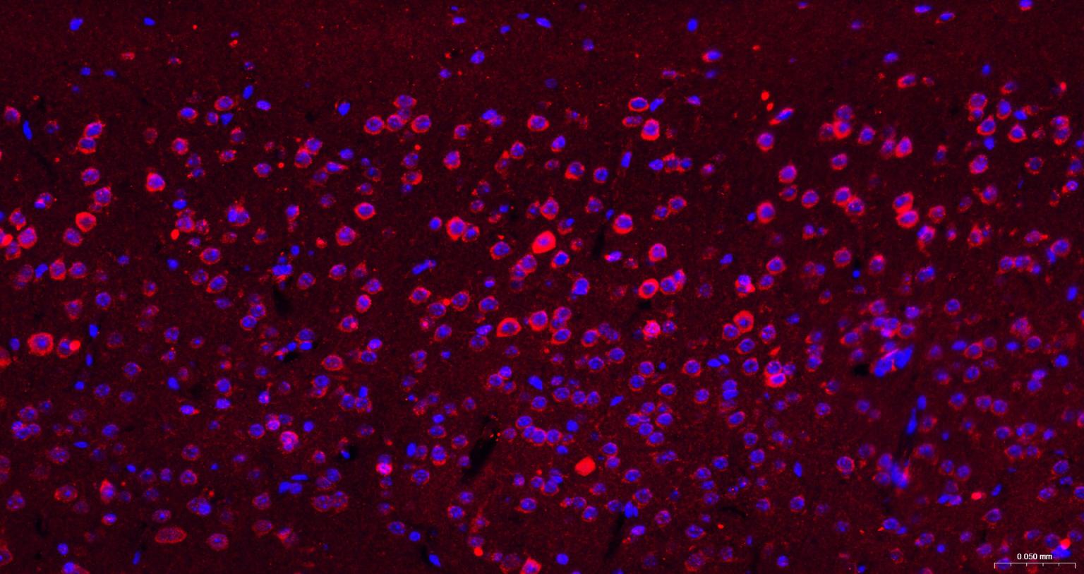 Paraformaldehyde-fixed, paraffin embedded Rat Cerebrum; Antigen retrieval by boiling in sodium citrate buffer (pH6.0) for 15 min; The section was incubated with TPH Monoclonal Antibody, Unconjugated (bsm-61227R) at 1:200 overnight at 4°C. Followed by conjugated Goat Anti-Rabbit IgG antibody (Red, bs-0295G-BF594), DAPI (blue, C02-04002) was used to stain the cell nuclei.