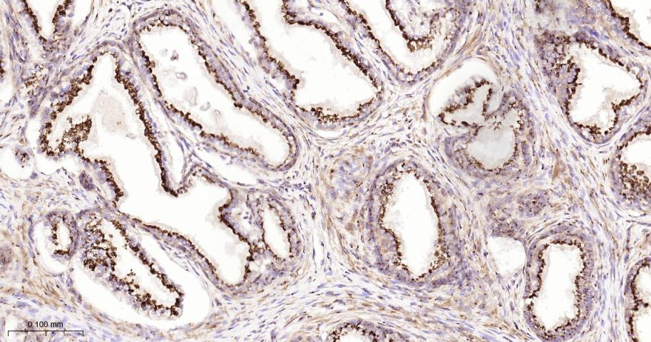 Paraformaldehyde-fixed, paraffin embedded Human Prostate; Antigen retrieval by boiling in sodium citrate buffer (pH6.0) for 15 min; The section was incubated with GOLPH2 Monoclonal Antibody, Unconjugated (bsm-61229R) at 1:200 overnight at 4°C, followed by conjugation to the bs-0295G-HRP and DAB (C-0010) staining.