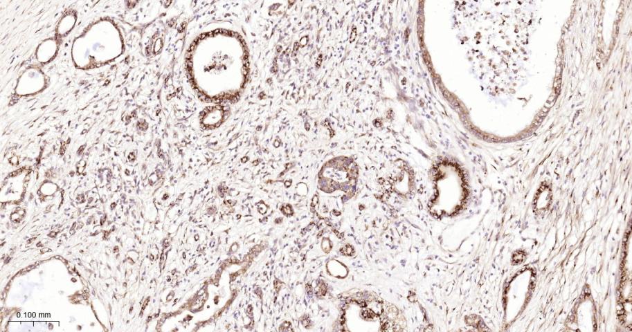 Paraformaldehyde-fixed, paraffin embedded Human Pancreatic Cancer; Antigen retrieval by boiling in sodium citrate buffer (pH6.0) for 15 min; The section was incubated with GOLPH2 Monoclonal Antibody, Unconjugated (bsm-61229R) at 1:200 overnight at 4°C, followed by conjugation to the bs-0295G-HRP and DAB (C-0010) staining.