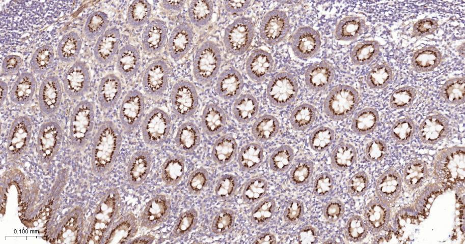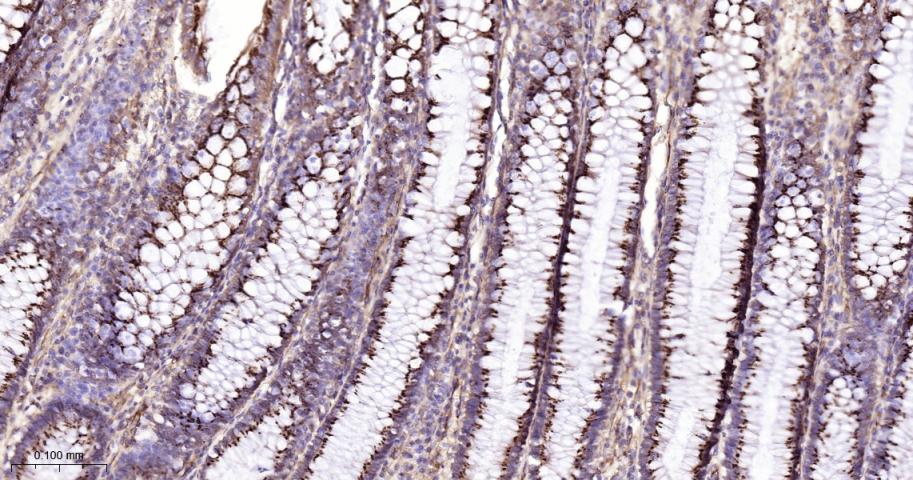 Paraformaldehyde-fixed, paraffin embedded Human Colon; Antigen retrieval by boiling in sodium citrate buffer (pH6.0) for 15 min; The section was incubated with GOLPH2 Monoclonal Antibody, Unconjugated (bsm-61229R) at 1:200 overnight at 4°C, followed by conjugation to the bs-0295G-HRP and DAB (C-0010) staining.