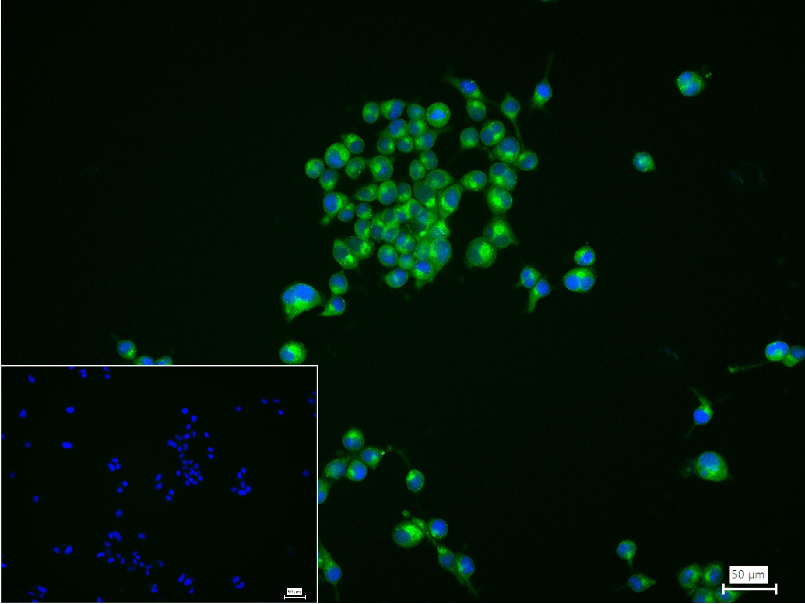 4% Paraformaldehyde-fixed LNCaP (H) cell; Triton X-100 at r.t. for 20 min; Antibody incubation with (GOLPH2) monoclonal Antibody, unconjugated (bsm-61229R) 1:100, 90 min at 37°C; followed by conjugated Goat Anti-Rabbit IgG antibody (green, bs-60295G-BF488) at 37°C for 90 min, DAPI (blue, C02-04002) was used to stain the cell nuclei. PBS instead of the primary antibody was used as the blank control.