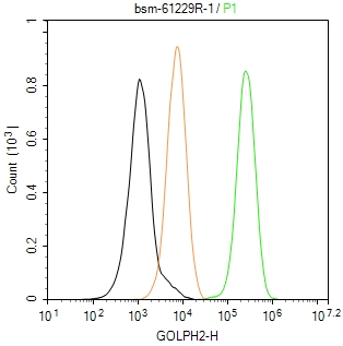 The LNCaP (H) cells were fixed with 4% PFA (10 min at r.t.) and then permeabilized with 90% ice-cold methanol for 20 min at -20℃,the cells then were incubated in 5%BSA to block non-specific protein-protein interactions (30 min at r.t.), followed by secondary antibody incubation for 40 min at room temperature. Primary Antibody (green):Rabbit Anti-GOLPH2 antibody (bsm-61229R,1:100); Isotype Control (orange): Rabbit IgG (bs-0295P). Blank control (black): PBS. Acquisition of 20,000 events was performed.