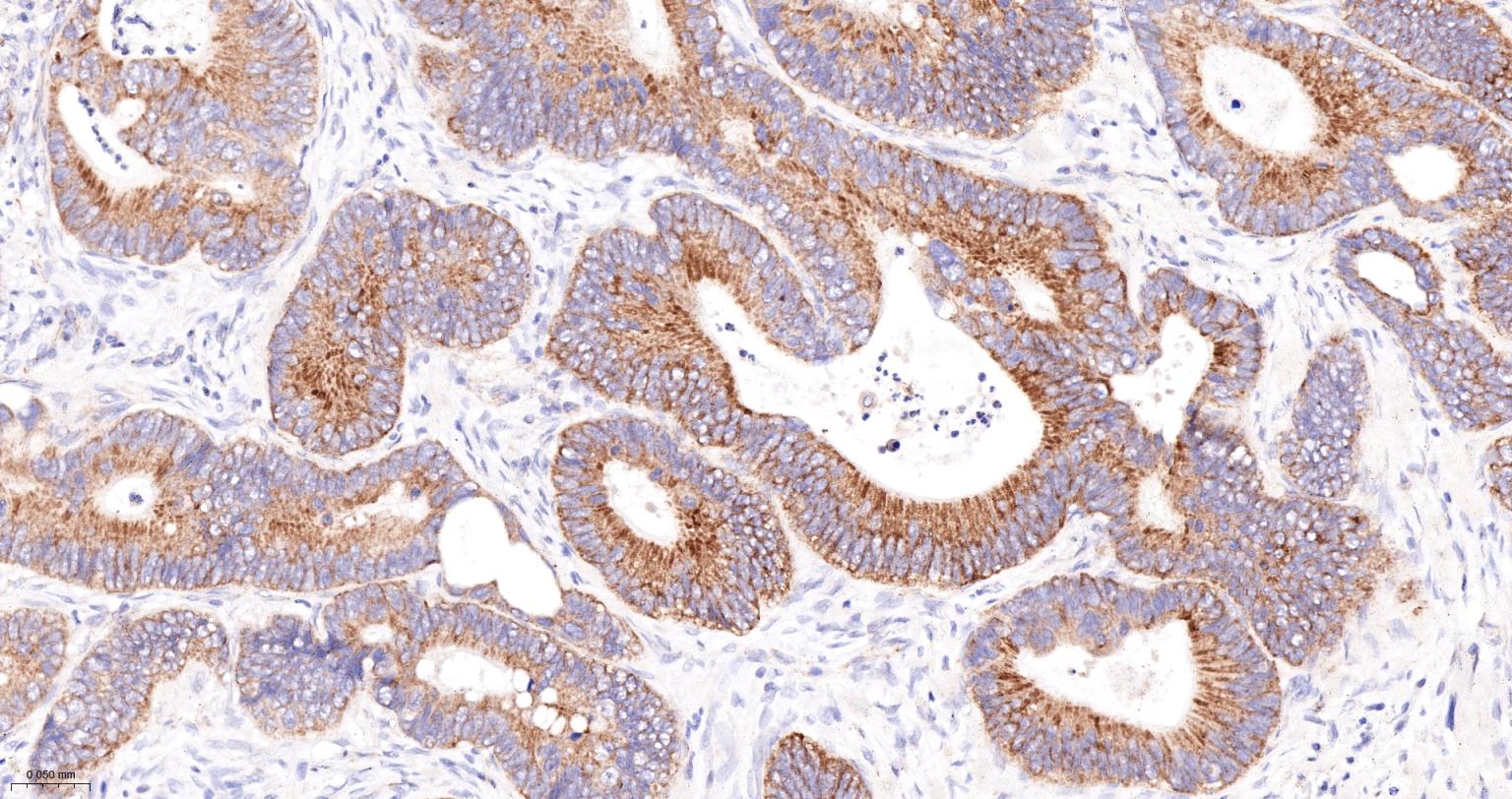 Paraformaldehyde-fixed, paraffin embedded Human Colon Cancer; Antigen retrieval by boiling in sodium citrate buffer (pH6.0) for 15 min; The section was incubated with HTRA2 Monoclonal Antibody, Unconjugated (bsm-61230R) at 1:200 overnight at 4°C, followed by conjugation to the bs-0295G-HRP and DAB (C-0010) staining.
