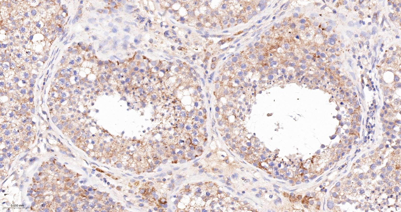 Paraformaldehyde-fixed, paraffin embedded Human Testicles; Antigen retrieval by boiling in sodium citrate buffer (pH6.0) for 15 min; The section was incubated with HTRA2 Monoclonal Antibody, Unconjugated (bsm-61230R) at 1:200 overnight at 4°C, followed by conjugation to the bs-0295G-HRP and DAB (C-0010) staining.