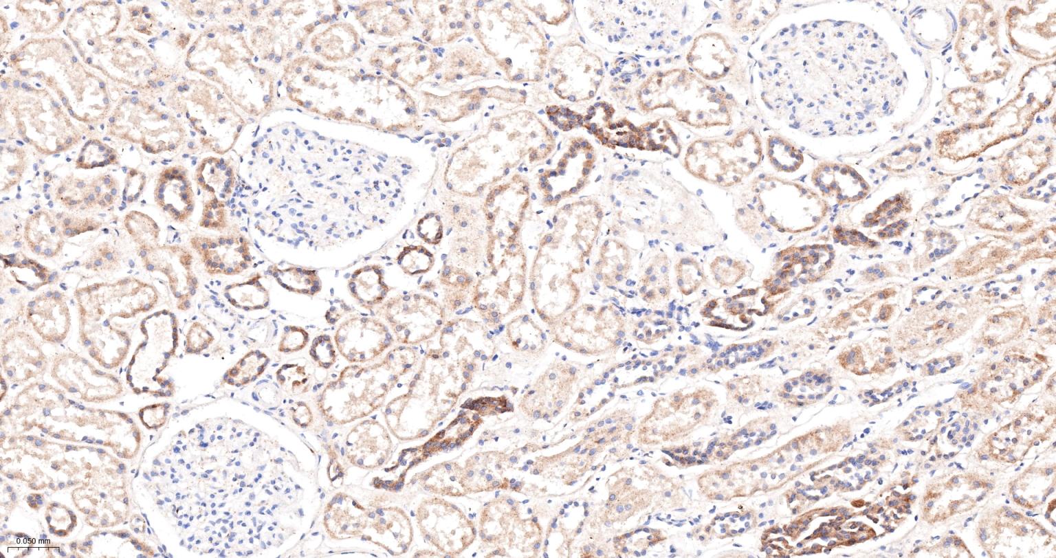 Paraformaldehyde-fixed, paraffin embedded Human Kidney; Antigen retrieval by boiling in sodium citrate buffer (pH6.0) for 15 min; The section was incubated with HTRA2 Monoclonal Antibody, Unconjugated (bsm-61230R) at 1:200 overnight at 4°C, followed by conjugation to the bs-0295G-HRP and DAB (C-0010) staining.