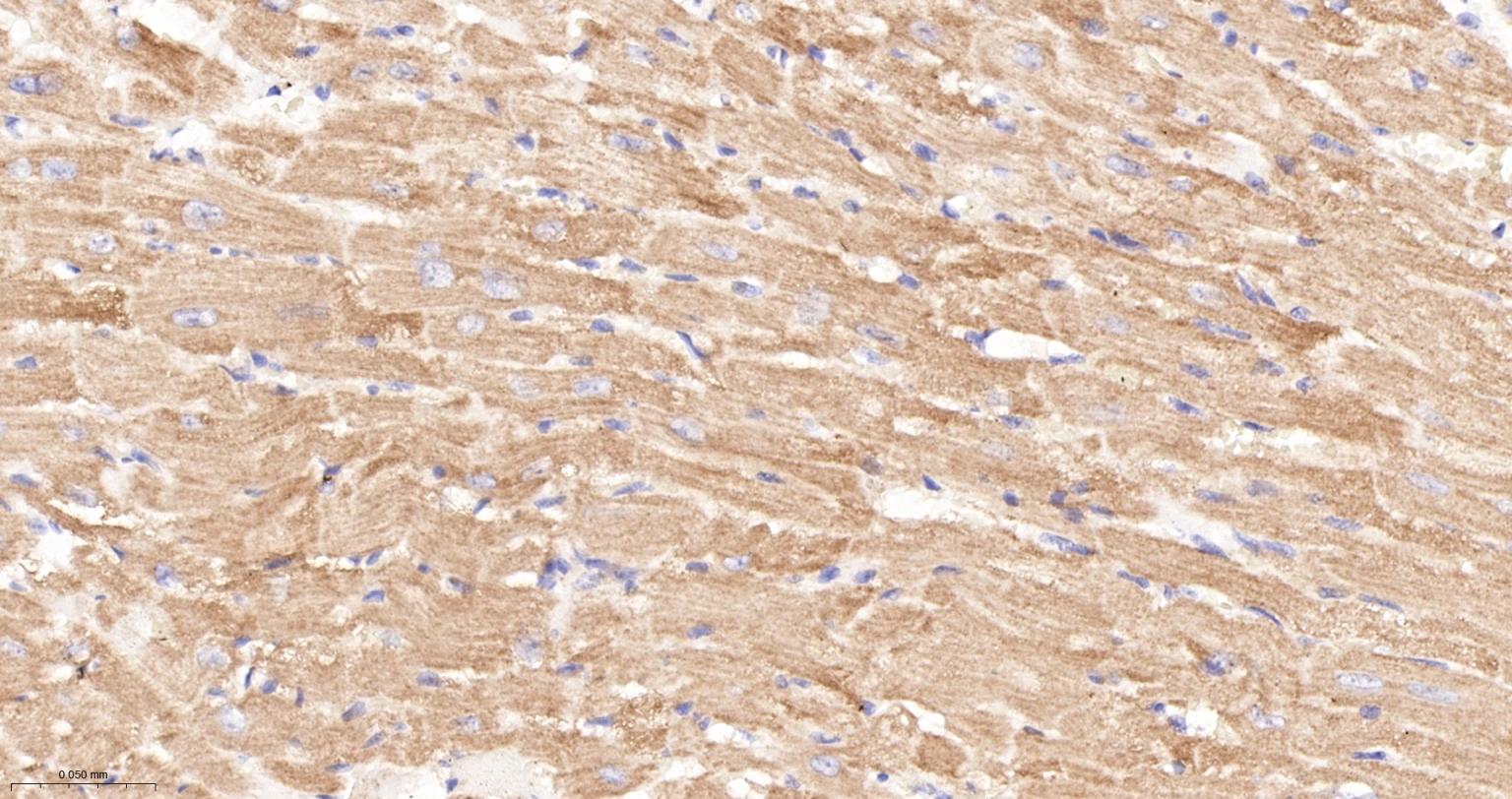 Paraformaldehyde-fixed, paraffin embedded Mouse Heart; Antigen retrieval by boiling in sodium citrate buffer (pH6.0) for 15 min; The section was incubated with HTRA2 Monoclonal Antibody, Unconjugated (bsm-61230R) at 1:200 overnight at 4°C, followed by conjugation to the bs-0295G-HRP and DAB (C-0010) staining.