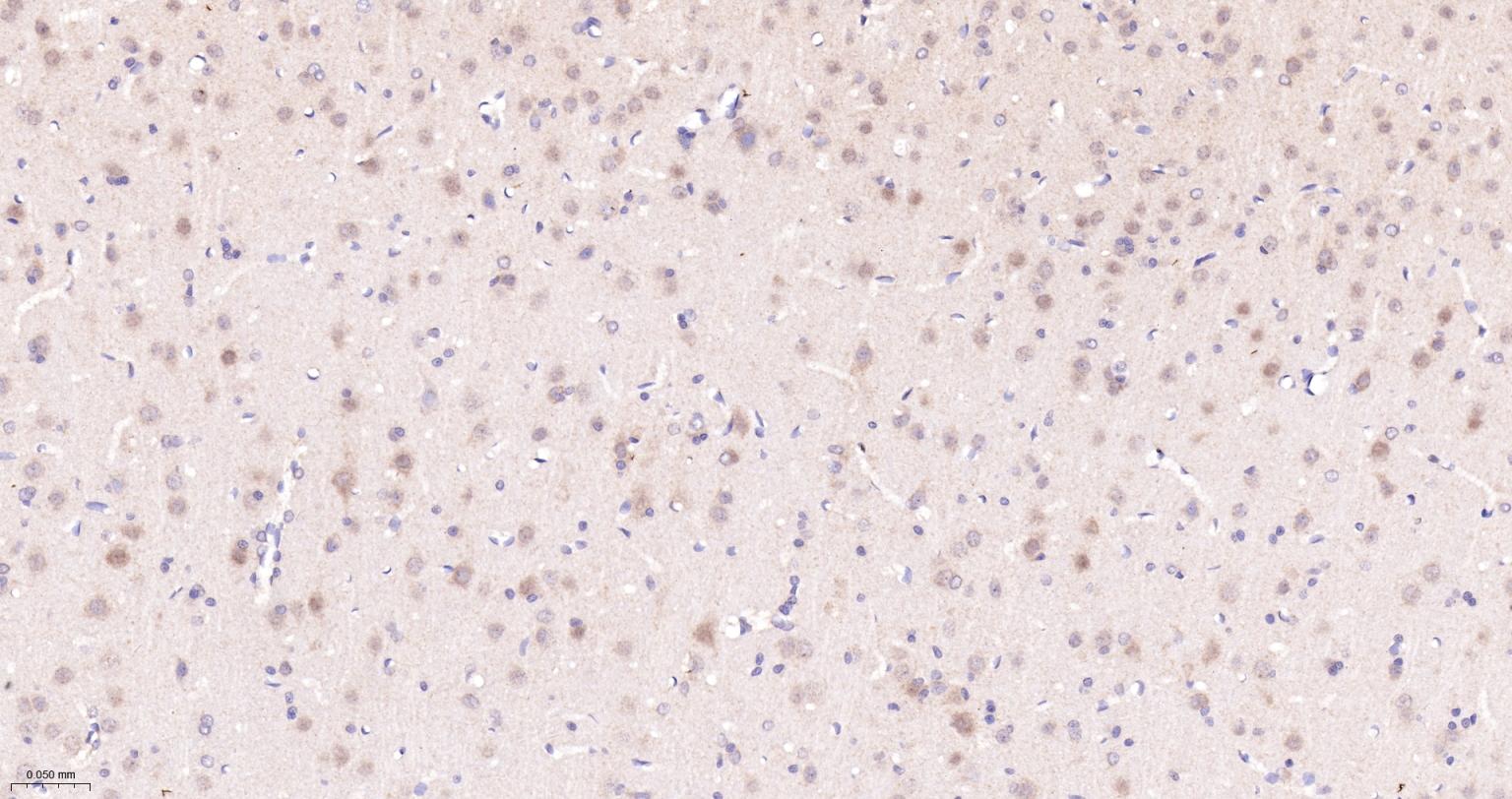 Paraformaldehyde-fixed, paraffin embedded Rat Cerebrum; Antigen retrieval by boiling in sodium citrate buffer (pH6.0) for 15 min; The section was incubated with HTRA2 Monoclonal Antibody, Unconjugated (bsm-61230R) at 1:200 overnight at 4°C, followed by conjugation to the bs-0295G-HRP and DAB (C-0010) staining.