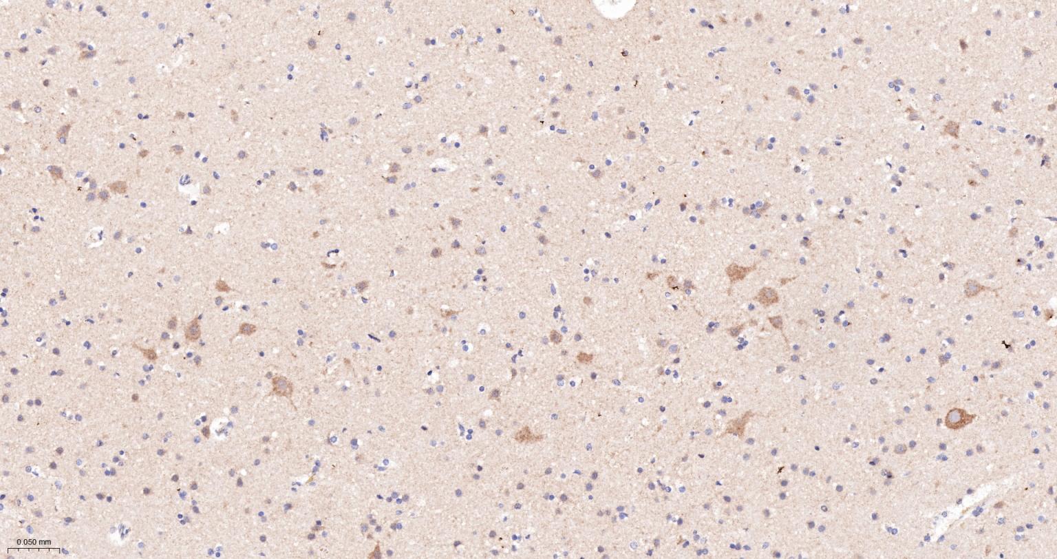 Paraformaldehyde-fixed, paraffin embedded Human Cerebrum; Antigen retrieval by boiling in sodium citrate buffer (pH6.0) for 15 min; The section was incubated with HTRA2 Monoclonal Antibody, Unconjugated (bsm-61230R) at 1:200 overnight at 4°C, followed by conjugation to the bs-0295G-HRP and DAB (C-0010) staining.