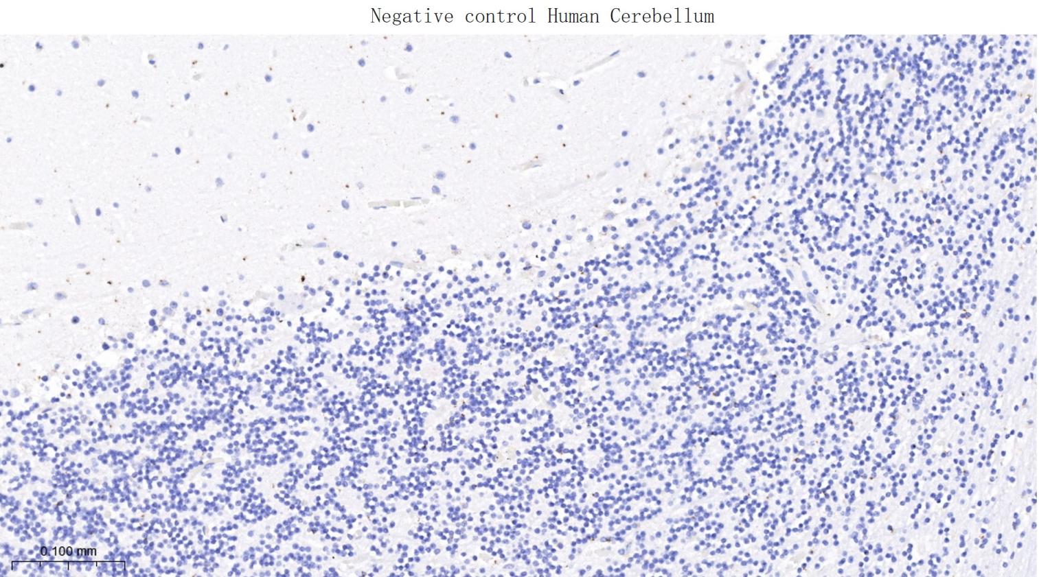 (Negative control) Paraformaldehyde-fixed, paraffin embedded Human Cerebellum; Antigen retrieval by boiling in sodium citrate buffer (pH6.0) for 15 min; The section was incubated with SERCA1 Monoclonal Antibody, Unconjugated (bsm-61239R) at 1:200 overnight at 4°C, followed by conjugation to the bs-0295G-HRP and DAB (C-0010) staining.