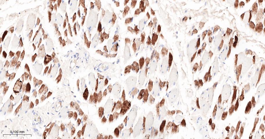 Paraformaldehyde-fixed, paraffin embedded Human Skeletal muscle; Antigen retrieval by boiling in sodium citrate buffer (pH6.0) for 15 min; The section was incubated with SERCA1 Monoclonal Antibody, Unconjugated (bsm-61239R) at 1:200 overnight at 4°C, followed by conjugation to the bs-0295G-HRP and DAB (C-0010) staining.