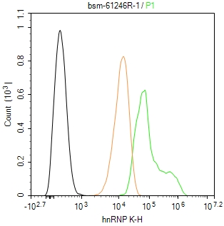 The Hela (H) cells were fixed with 4% PFA (10 min at r.t.) and then permeabilized with 90% ice-cold methanol for 20 min at -20℃,the cells then were incubated in 5%BSA to block non-specific protein-protein interactions (30 min at r.t.), followed by secondary antibody incubation for 40 min at room temperature. Primary Antibody (green):Rabbit Anti-hnRNP K antibody (bsm-61246R,1:100); Isotype Control (orange): Rabbit IgG (bs-0295P). Blank control (black): PBS. Acquisition of 20,000 events was performed.