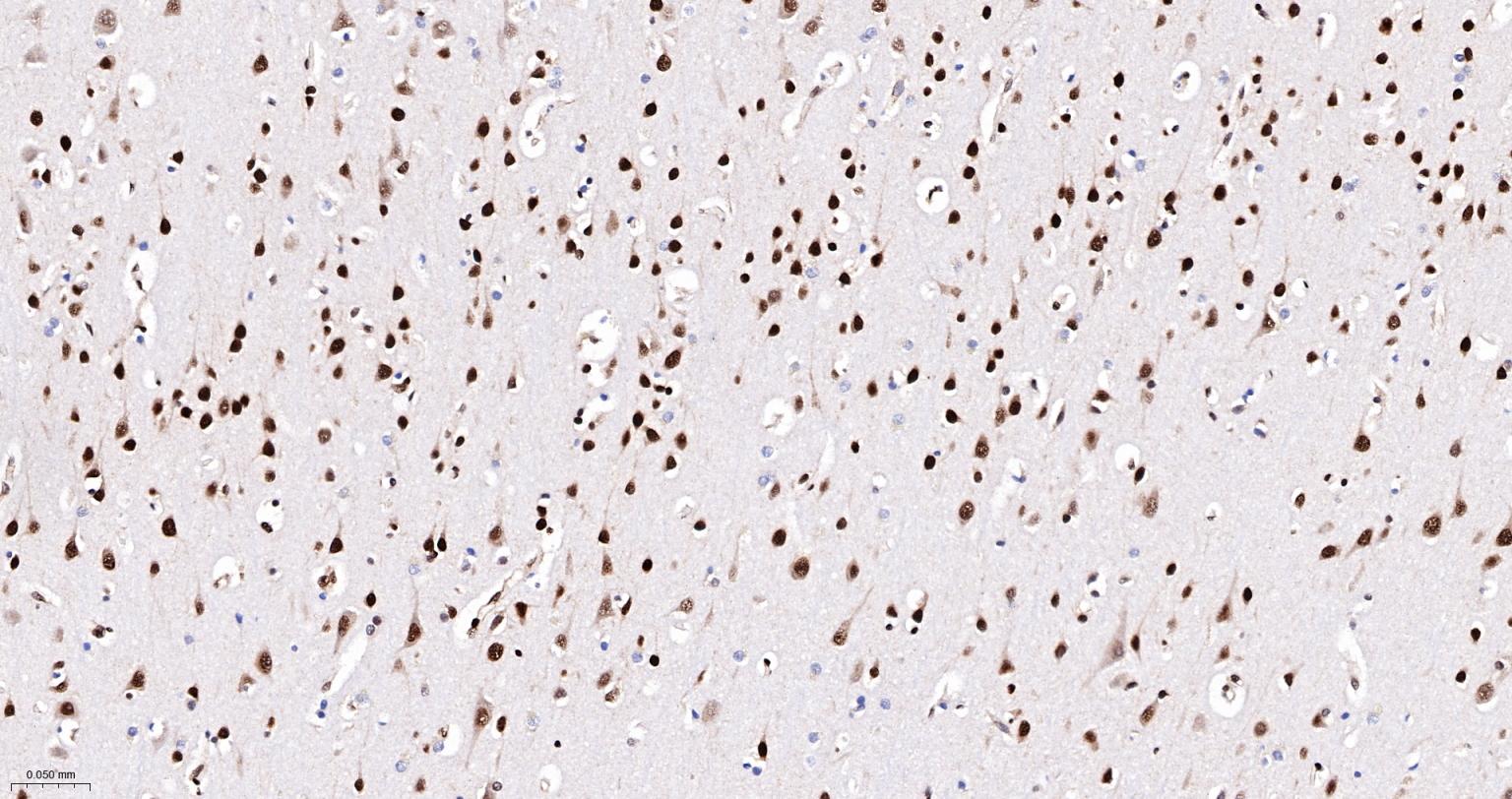 Paraformaldehyde-fixed, paraffin embedded Rat Cerebrum; Antigen retrieval by boiling in sodium citrate buffer (pH6.0) for 15 min; The section was incubated with hnRNP K Monoclonal Antibody, Unconjugated (bsm-61246R) at 1:200 overnight at 4°C, followed by conjugation to the bs-0295G-HRP and DAB (C-0010) staining.