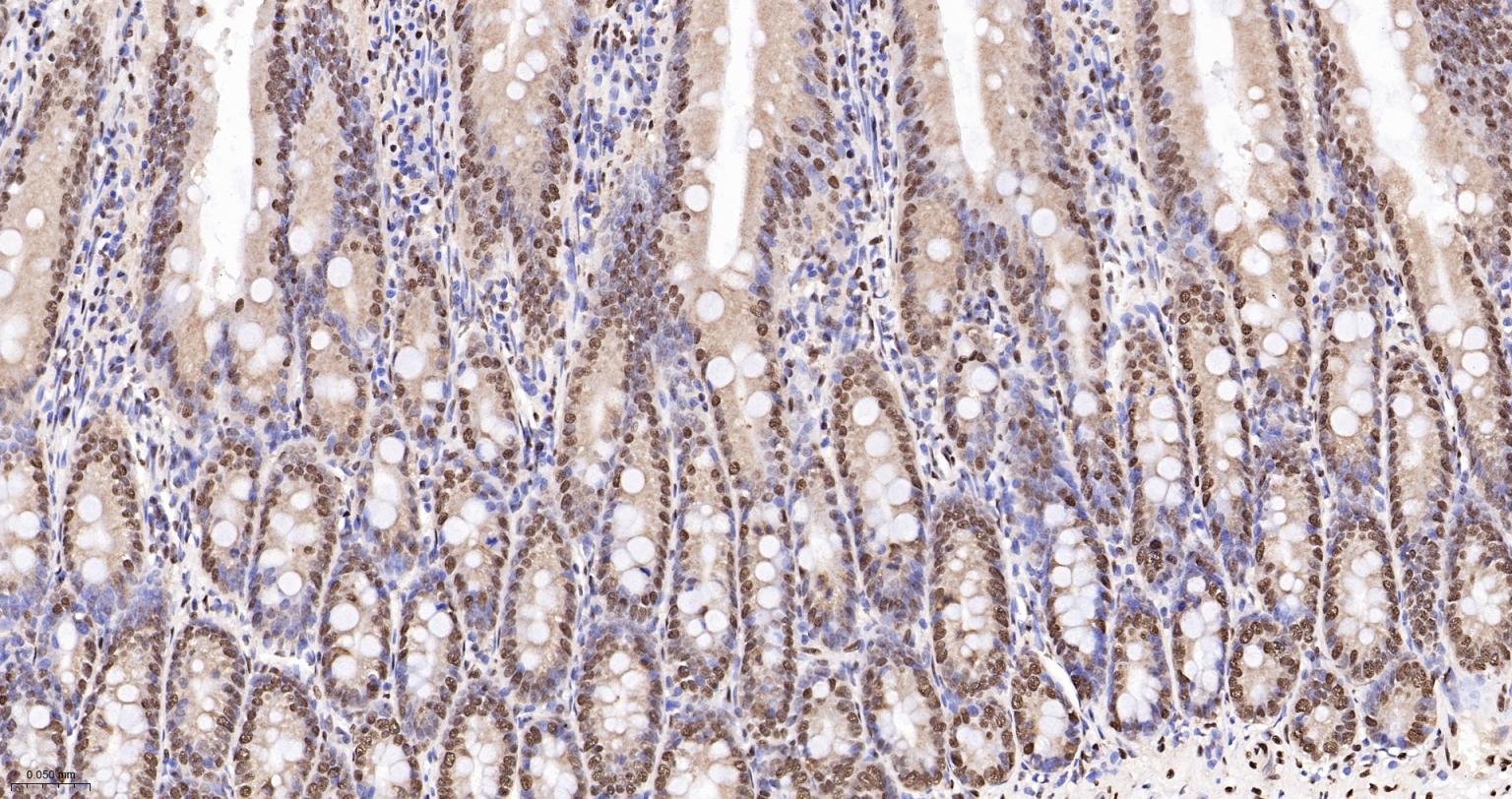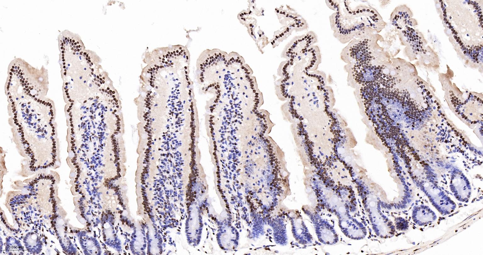 Paraformaldehyde-fixed, paraffin embedded Mouse Small Intestine; Antigen retrieval by boiling in sodium citrate buffer (pH6.0) for 15 min; The section was incubated with hnRNP K Monoclonal Antibody, Unconjugated (bsm-61246R) at 1:200 overnight at 4°C, followed by conjugation to the bs-0295G-HRP and DAB (C-0010) staining.