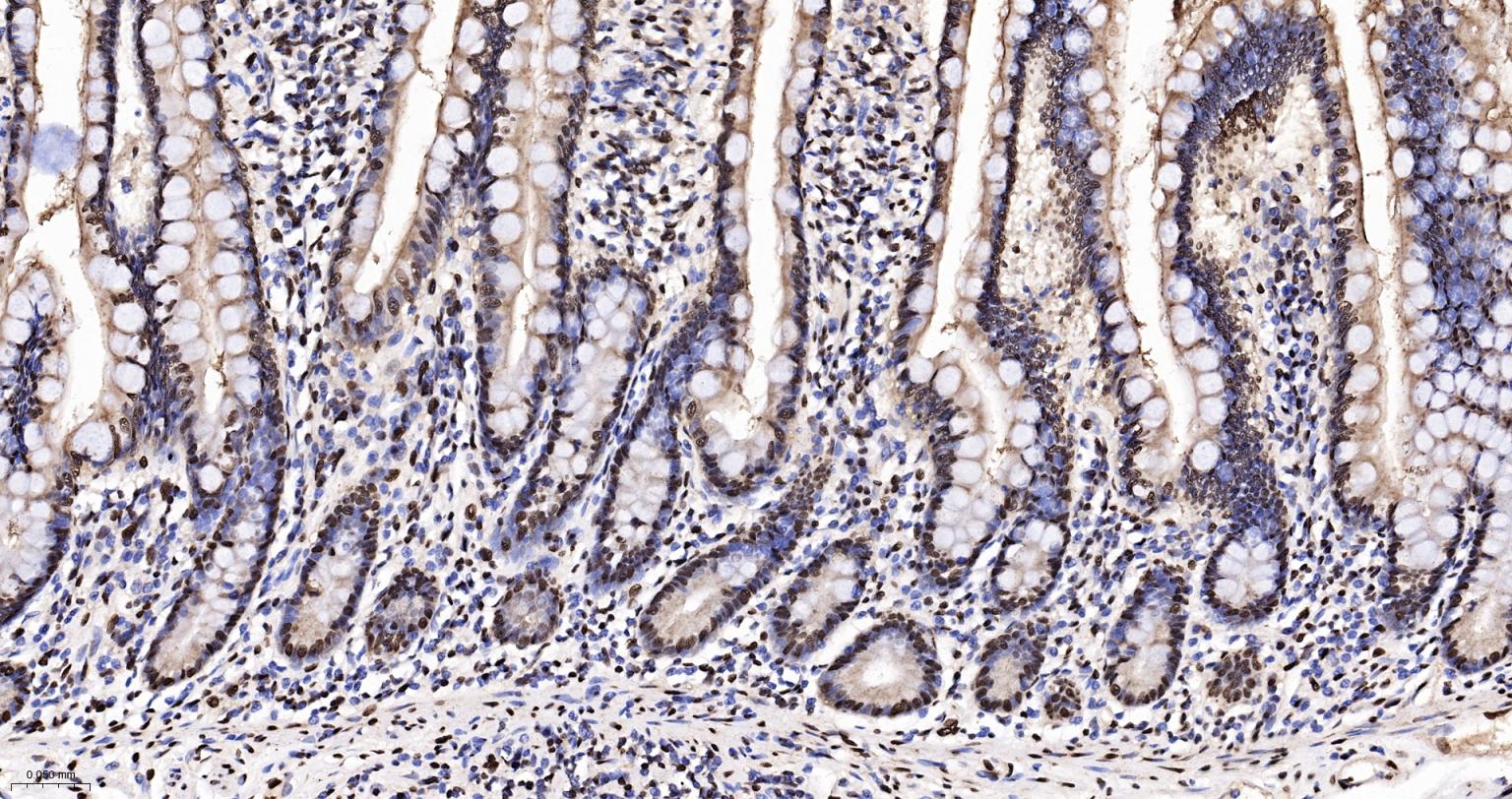 Paraformaldehyde-fixed, paraffin embedded Human Small Intestine; Antigen retrieval by boiling in sodium citrate buffer (pH6.0) for 15 min; The section was incubated with hnRNP K Monoclonal Antibody, Unconjugated (bsm-61246R) at 1:200 overnight at 4°C, followed by conjugation to the bs-0295G-HRP and DAB (C-0010) staining.