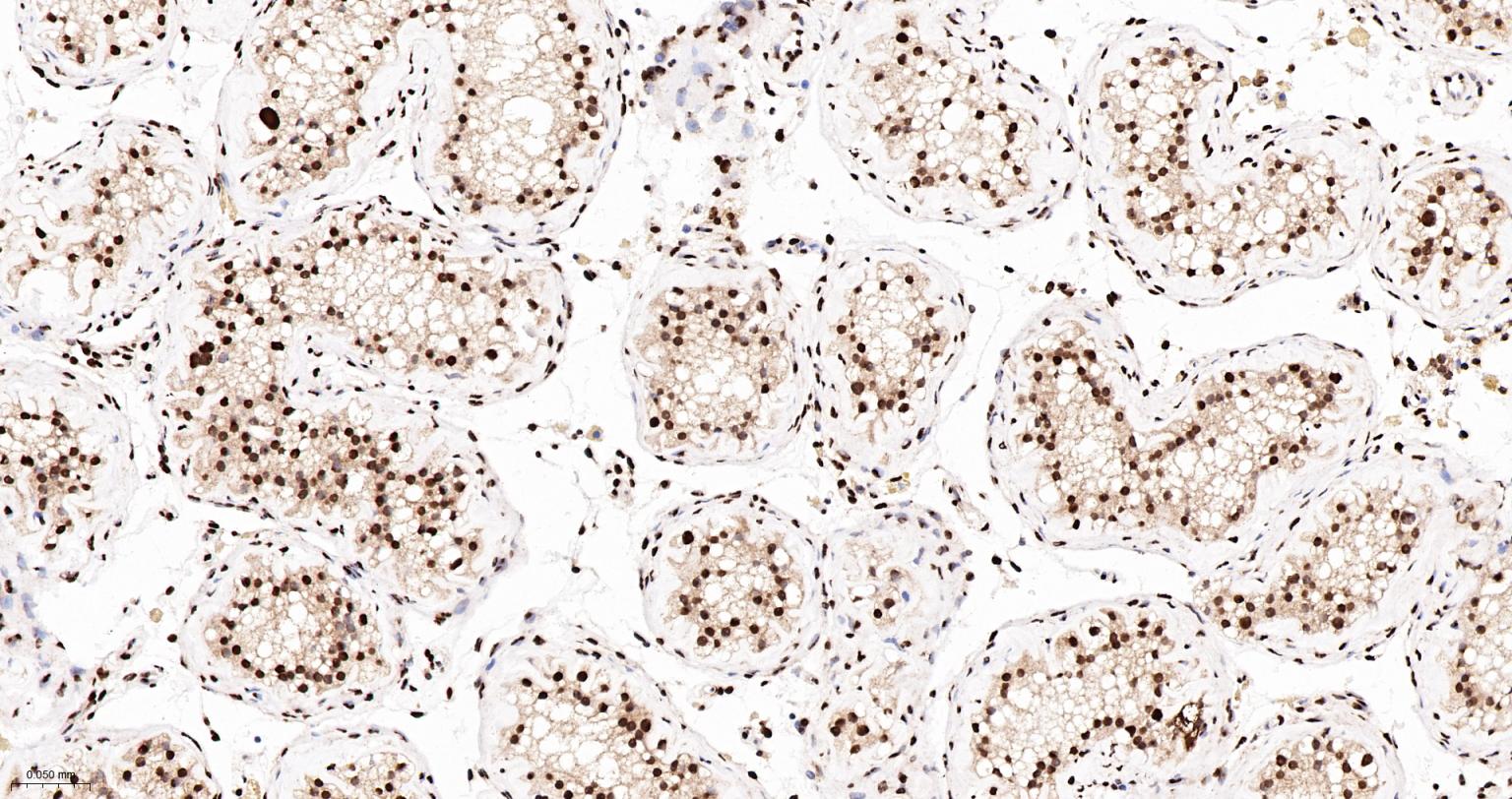 Paraformaldehyde-fixed, paraffin embedded Human Testicles; Antigen retrieval by boiling in sodium citrate buffer (pH6.0) for 15 min; The section was incubated with hnRNP K Monoclonal Antibody, Unconjugated (bsm-61246R) at 1:200 overnight at 4°C, followed by conjugation to the bs-0295G-HRP and DAB (C-0010) staining.