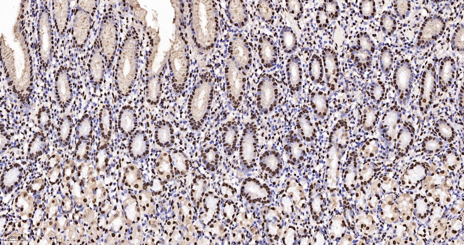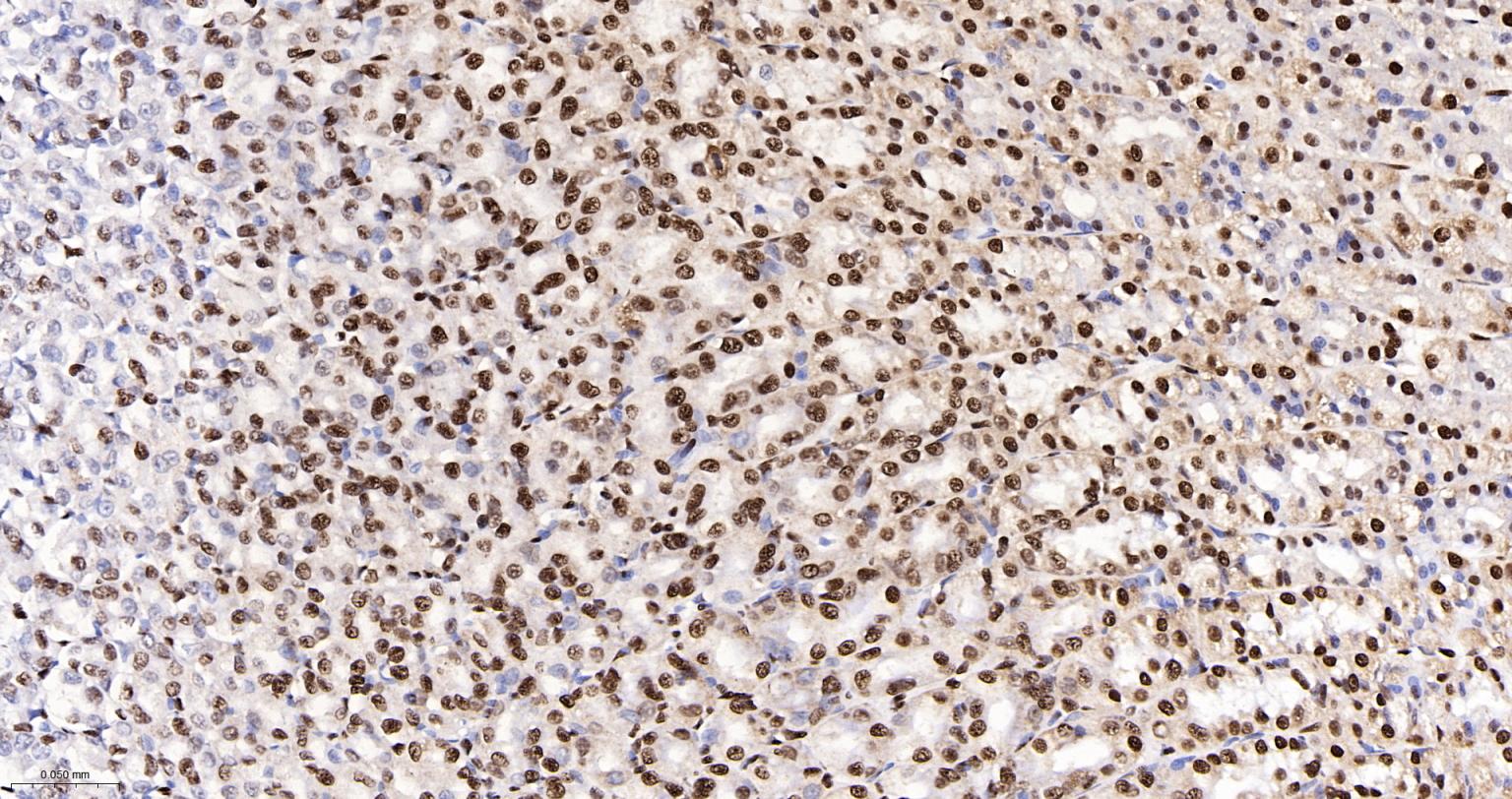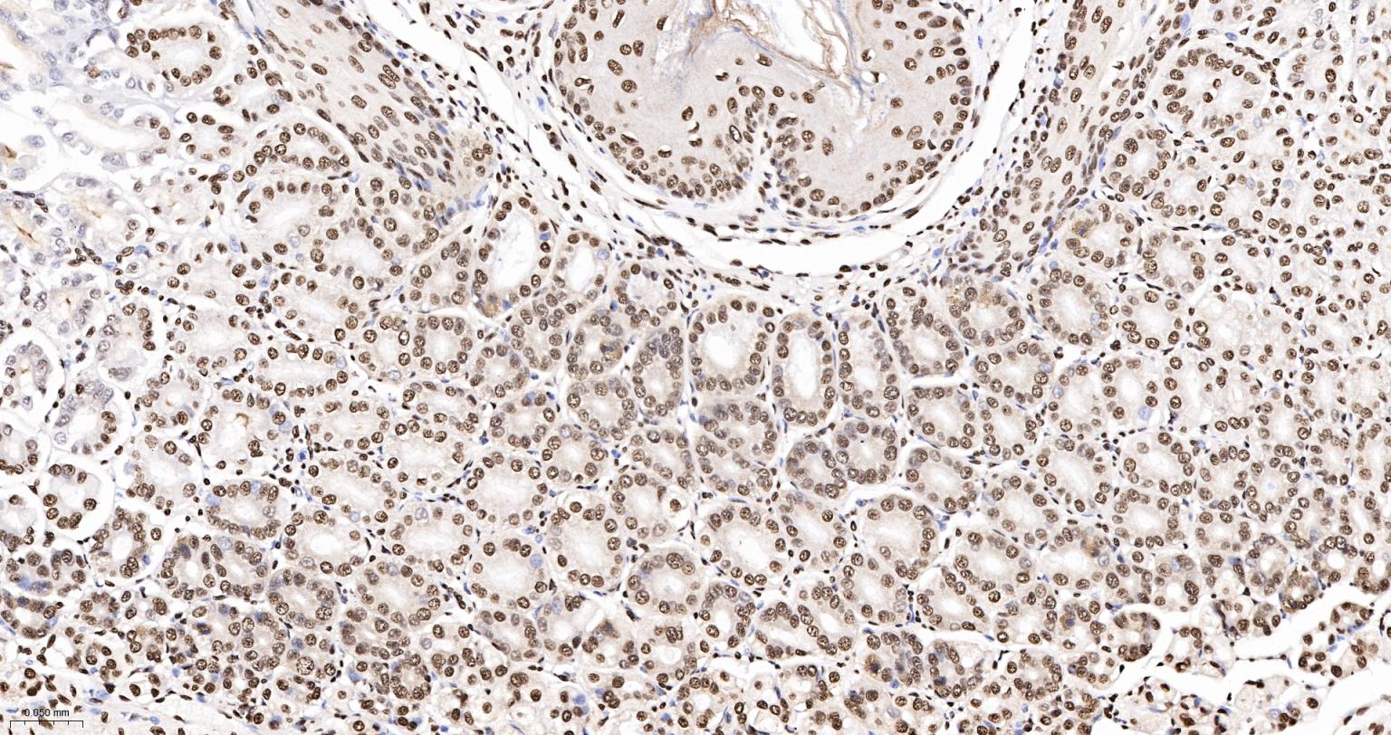 Paraformaldehyde-fixed, paraffin embedded Rat Stomach; Antigen retrieval by boiling in sodium citrate buffer (pH6.0) for 15 min; The section was incubated with hnRNP K Monoclonal Antibody, Unconjugated (bsm-61246R) at 1:200 overnight at 4°C, followed by conjugation to the bs-0295G-HRP and DAB (C-0010) staining.
