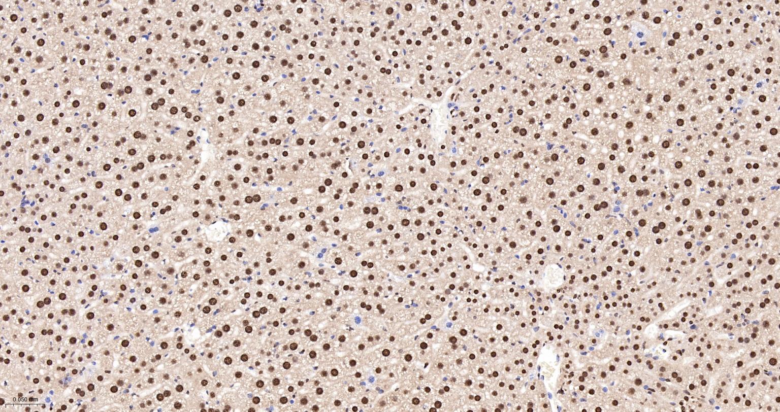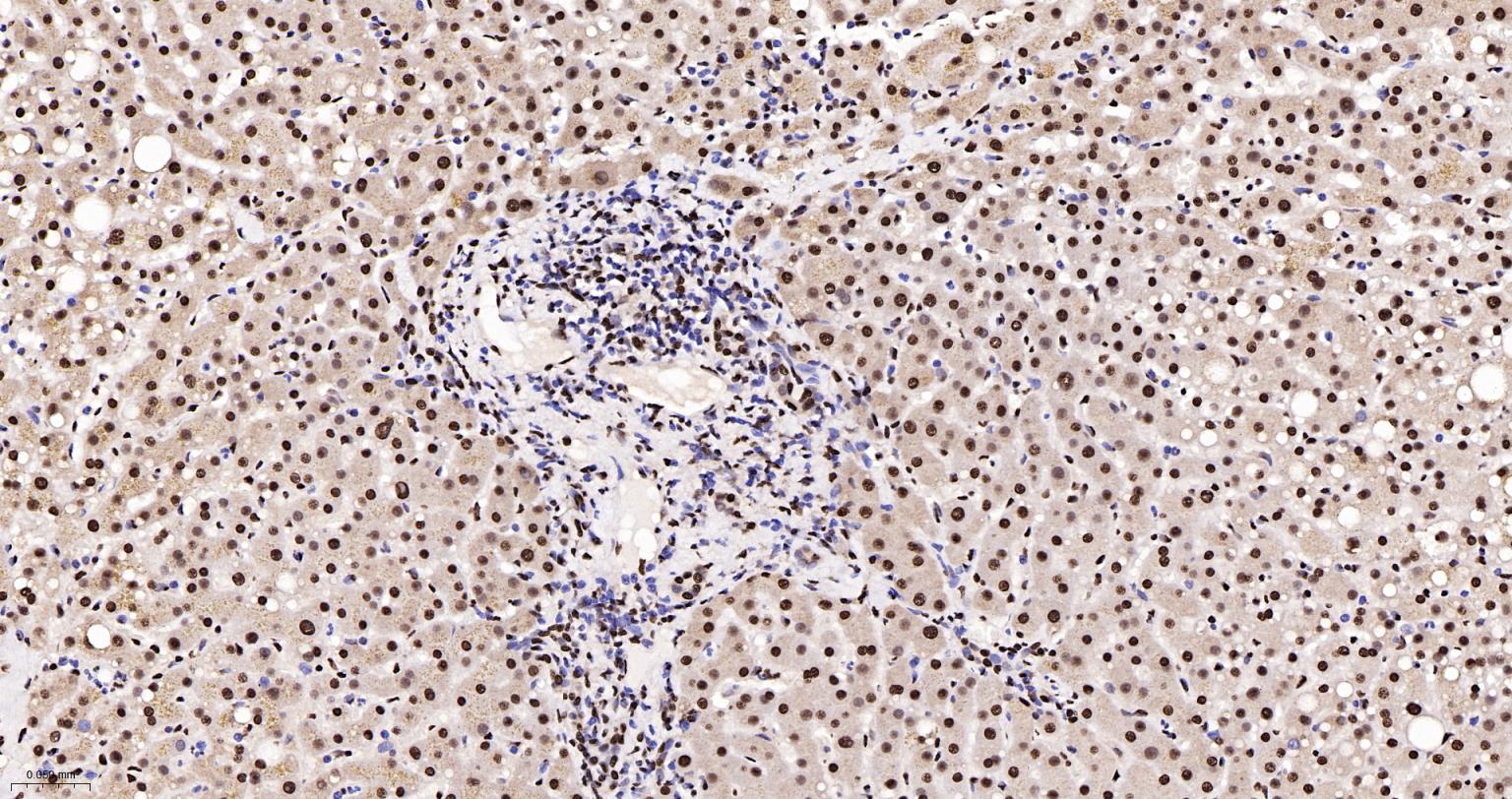 Paraformaldehyde-fixed, paraffin embedded Rat Liver; Antigen retrieval by boiling in sodium citrate buffer (pH6.0) for 15 min; The section was incubated with hnRNP K Monoclonal Antibody, Unconjugated (bsm-61246R) at 1:200 overnight at 4°C, followed by conjugation to the bs-0295G-HRP and DAB (C-0010) staining.