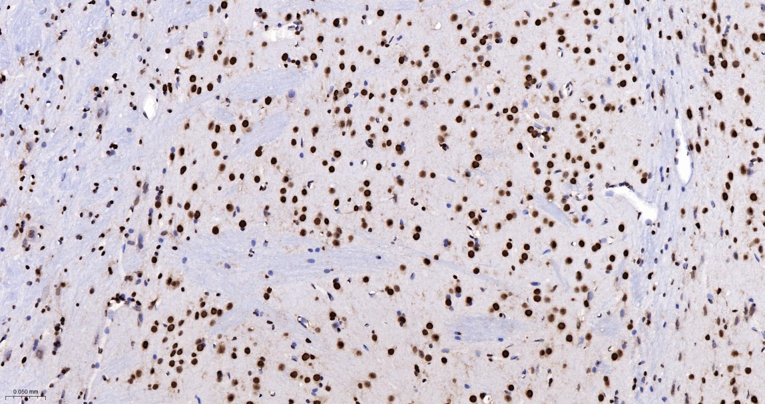 Paraformaldehyde-fixed, paraffin embedded Human Cerebrum; Antigen retrieval by boiling in sodium citrate buffer (pH6.0) for 15 min; The section was incubated with hnRNP K Monoclonal Antibody, Unconjugated (bsm-61246R) at 1:200 overnight at 4°C, followed by conjugation to the bs-0295G-HRP and DAB (C-0010) staining.