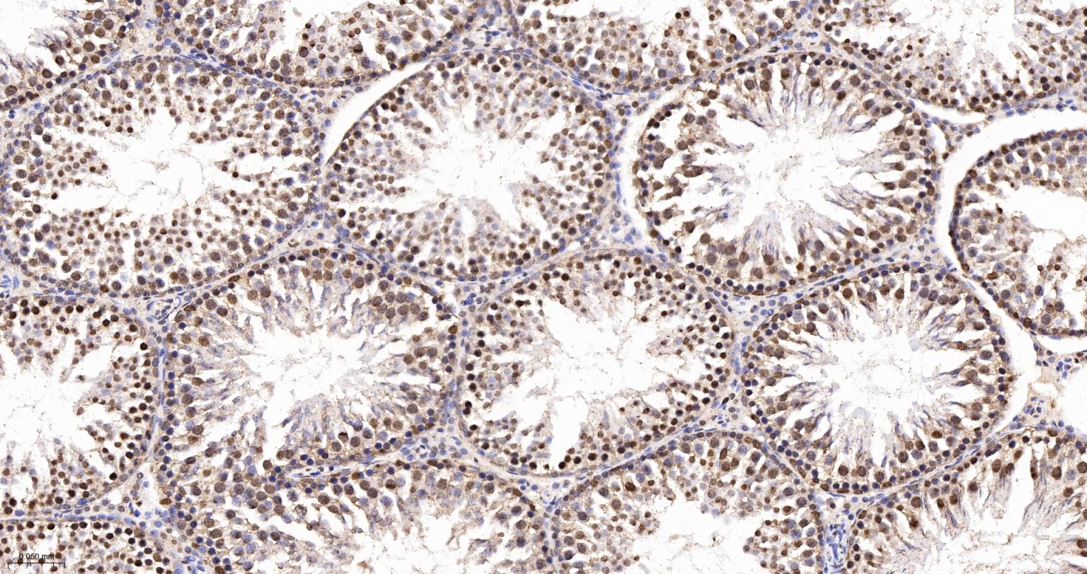 Paraformaldehyde-fixed, paraffin embedded Mouse Testicles; Antigen retrieval by boiling in sodium citrate buffer (pH6.0) for 15 min; The section was incubated with hnRNP K Monoclonal Antibody, Unconjugated (bsm-61246R) at 1:200 overnight at 4°C, followed by conjugation to the bs-0295G-HRP and DAB (C-0010) staining.