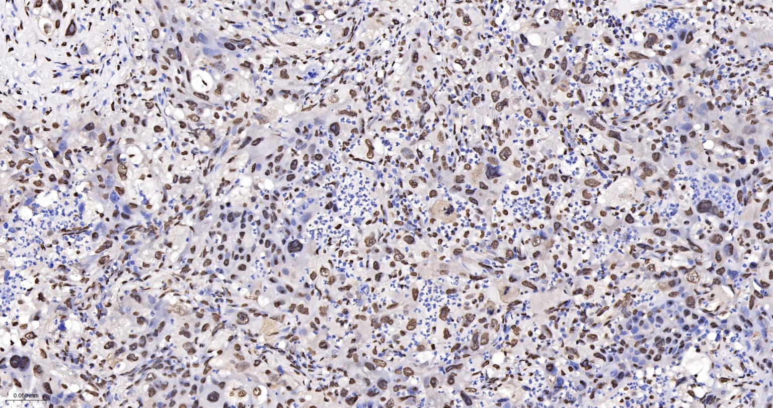 Paraformaldehyde-fixed, paraffin embedded Human Lung Cancer; Antigen retrieval by boiling in sodium citrate buffer (pH6.0) for 15 min; The section was incubated with hnRNP K Monoclonal Antibody, Unconjugated (bsm-61246R) at 1:200 overnight at 4°C, followed by conjugation to the bs-0295G-HRP and DAB (C-0010) staining.