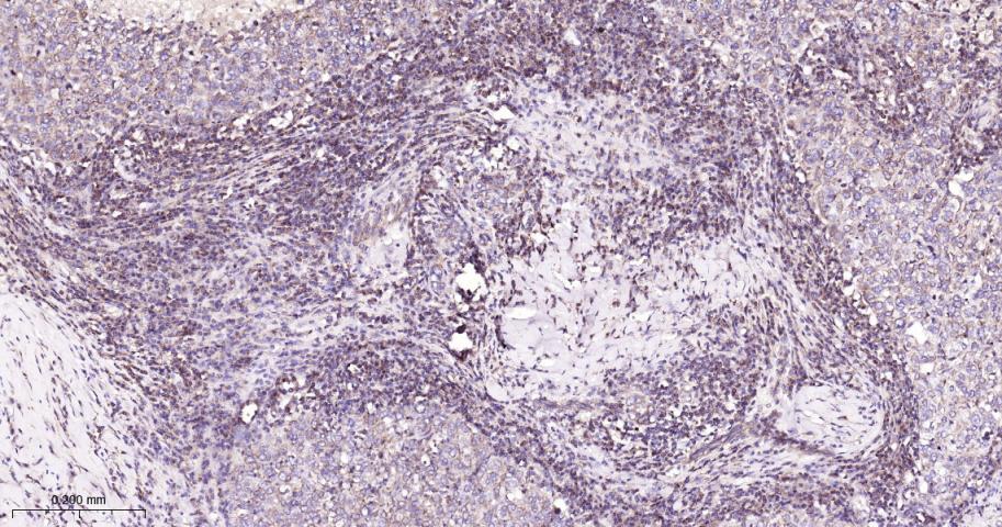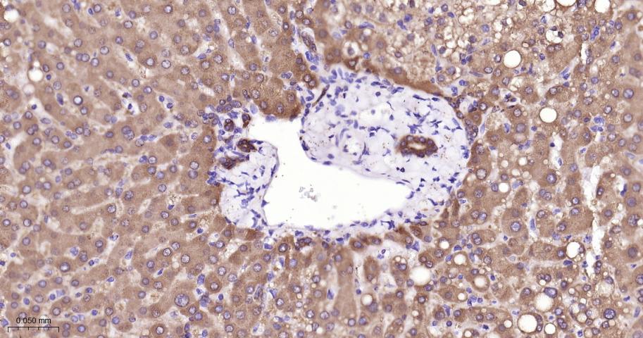 Paraformaldehyde-fixed, paraffin embedded Human Liver; Antigen retrieval by boiling in sodium citrate buffer (pH6.0) for 15 min; The section was incubated with SCF Monoclonal Antibody, Unconjugated (bsm-61250R) at 1:200 overnight at 4°C, followed by conjugation to the bs-0295G-HRP and DAB (C-0010) staining.