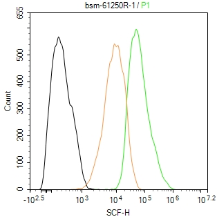 The MCF-7 (H) cells were fixed with 4% PFA (10 min at r.t.) and then permeabilized with 90% ice-cold methanol for 20 min at -20℃,the cells then were incubated in 5%BSA to block non-specific protein-protein interactions (30 min at r.t.), followed by secondary antibody incubation for 40 min at room temperature. Primary Antibody (green):Rabbit Anti-SCF antibody (bsm-61250R): 1 μg/10^6 cells; Isotype Control (orange): Rabbit IgG (bs-0295P). Blank control (black): PBS. Acquisition of 20,000 events was performed.