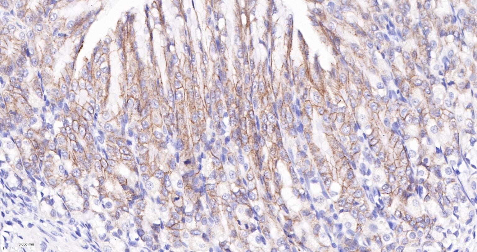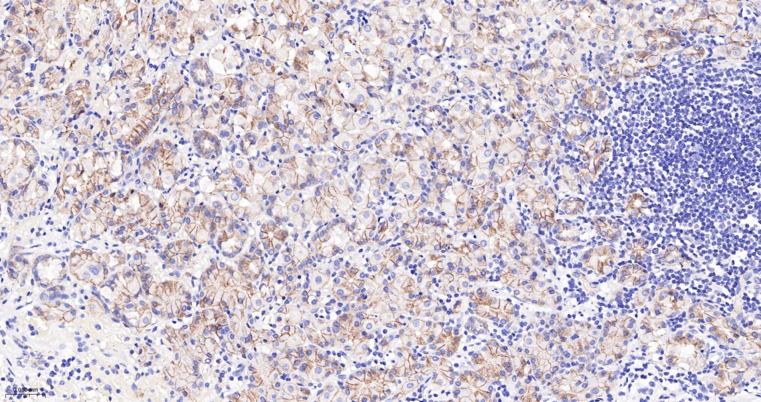 Paraformaldehyde-fixed, paraffin embedded Human Stomach; Antigen retrieval by boiling in sodium citrate buffer (pH6.0) for 15 min; The section was incubated with CTNNA1 Monoclonal Antibody, Unconjugated (bsm-61252R) at 1:200 overnight at 4°C, followed by conjugation to the bs-0295G-HRP and DAB (C-0010) staining.