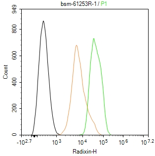 The Hela (H) cells were fixed with 4% PFA (10 min at r.t.) and then permeabilized with 90% ice-cold methanol for 20 min at -20℃,the cells then were incubated in 5%BSA to block non-specific protein-protein interactions (30 min at r.t.), followed by secondary antibody incubation for 40 min at room temperature. Primary Antibody (green):Rabbit Anti-Radixin antibody (bsm-61253R,1:100); Isotype Control (orange): Rabbit IgG (bs-0295P). Blank control (black): PBS. Acquisition of 20,000 events was performed.