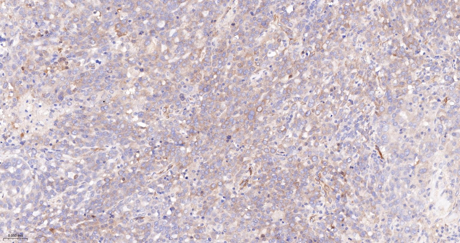 Paraformaldehyde-fixed, paraffin embedded Human Ovarian Cancer; Antigen retrieval by boiling in sodium citrate buffer (pH6.0) for 15 min; The section was incubated with Radixin Monoclonal Antibody, Unconjugated (bsm-61253R) at 1:200 overnight at 4°C, followed by conjugation to the bs-0295G-HRP and DAB (C-0010) staining.