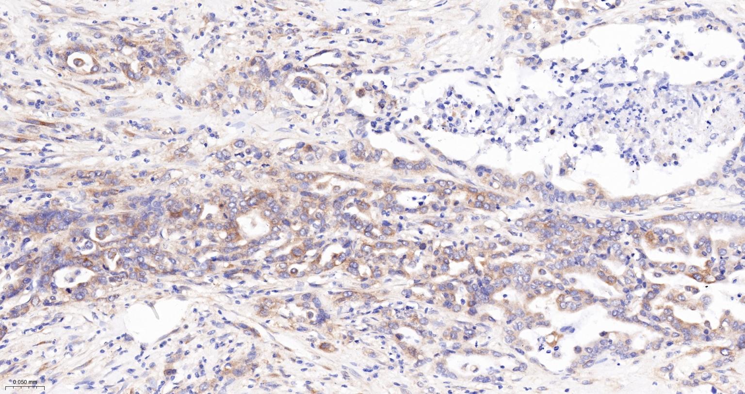 Paraformaldehyde-fixed, paraffin embedded Human Pancreatic Cancer; Antigen retrieval by boiling in sodium citrate buffer (pH6.0) for 15 min; The section was incubated with Radixin Monoclonal Antibody, Unconjugated (bsm-61253R) at 1:200 overnight at 4°C, followed by conjugation to the bs-0295G-HRP and DAB (C-0010) staining.