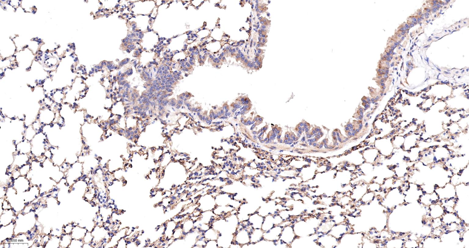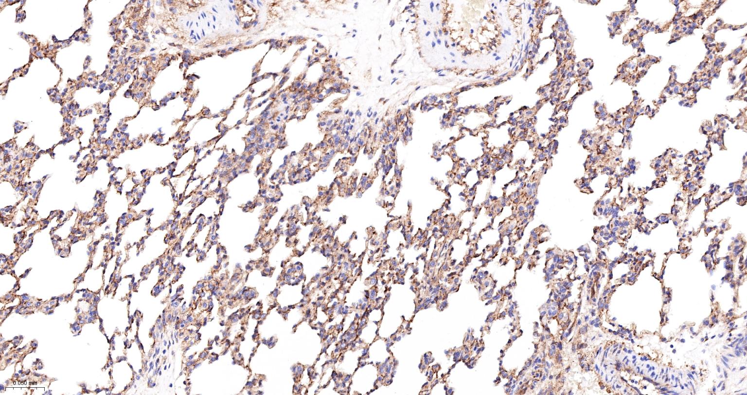 Paraformaldehyde-fixed, paraffin embedded Mouse Lung; Antigen retrieval by boiling in sodium citrate buffer (pH6.0) for 15 min; The section was incubated with Radixin Monoclonal Antibody, Unconjugated (bsm-61253R) at 1:200 overnight at 4°C, followed by conjugation to the bs-0295G-HRP and DAB (C-0010) staining.