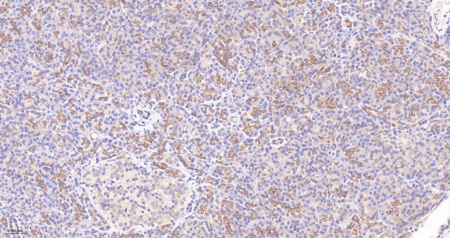 Paraformaldehyde-fixed, paraffin embedded Human Pancreas; Antigen retrieval by boiling in sodium citrate buffer (pH6.0) for 15 min; The section was incubated with Radixin Monoclonal Antibody, Unconjugated (bsm-61253R) at 1:200 overnight at 4°C, followed by conjugation to the bs-0295G-HRP and DAB (C-0010) staining.