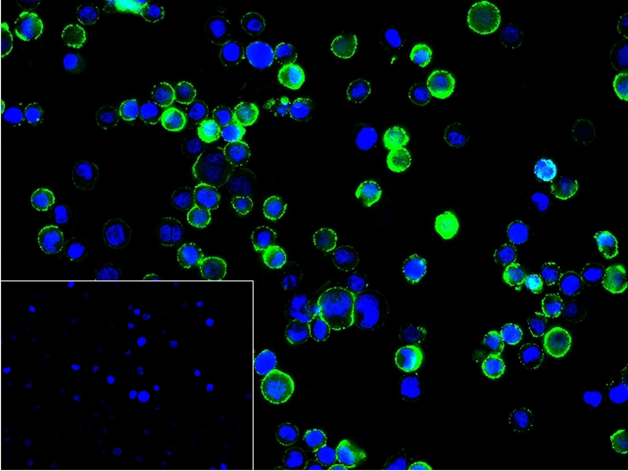 4% Paraformaldehyde-fixed Raji (H) cell; Antibody incubation with (LSP1) monoclonal Antibody, unconjugated (bsm-61255R) 1:100, 90 min at 37°C; followed by conjugated Goat Anti-Rabbit IgG antibody (green, bs-60295G-BF488) at 37°C for 90 min, DAPI (blue, C02-04002) was used to stain the cell nuclei. PBS instead of the primary antibody was used as the blank control.