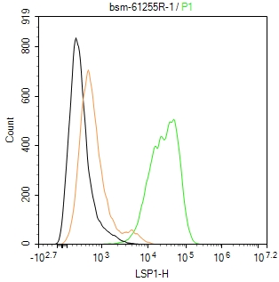 The Raji (H) cells were incubated in 5%BSA to block non-specific protein-protein interactions (30 min at r.t.) , followed by secondary antibody incubation for 40 min at room temperature. Primary Antibody (green): Rabbit Anti-LSP1 antibody (bsm-61255R,1:100); Isotype Control (orange): Rabbit IgG (bs-0295P). Blank control (black): PBS. Acquisition of 20,000 events was performed.