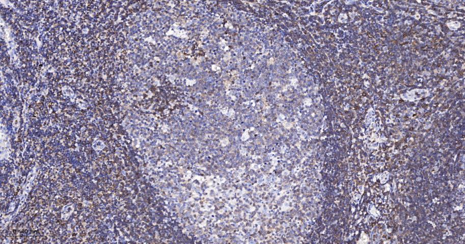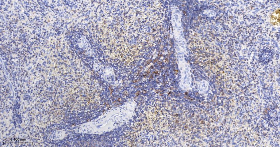 Paraformaldehyde-fixed, paraffin embedded Human spleen; Antigen retrieval by boiling in sodium citrate buffer (pH6.0) for 15 min; The section was incubated with LSP1 Monoclonal Antibody, Unconjugated (bsm-61255R) at 1:200 overnight at 4°C, followed by conjugation to the bs-0295G-HRP and DAB (C-0010) staining.